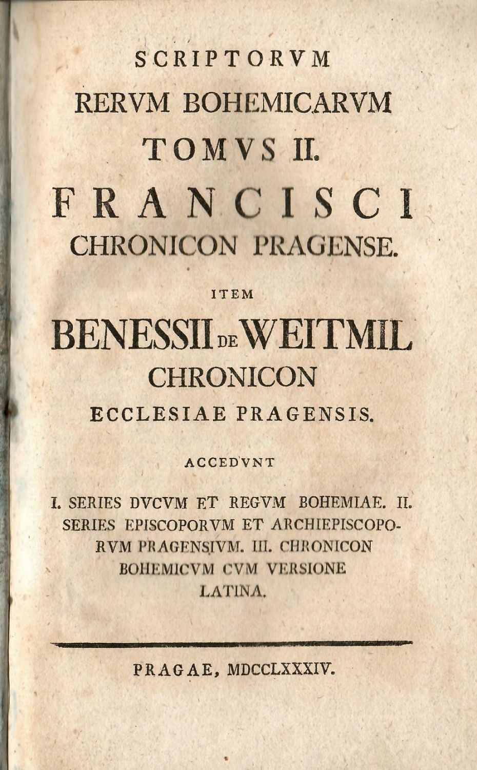 Scriptorum Rervm Bohinicarvm Tomvs II. Francisci Chronicon Pragense. Item Benessii de Weitmil Chronicon Ecclesiae Pragensis. Accedvnt I. Series Dvcvm et Regvm Bohemiae. II. Series Episcoporvm et Archiepiscoporvm Pragensivm. III. Chronicon Bohemicvm cvm Versione Latina.