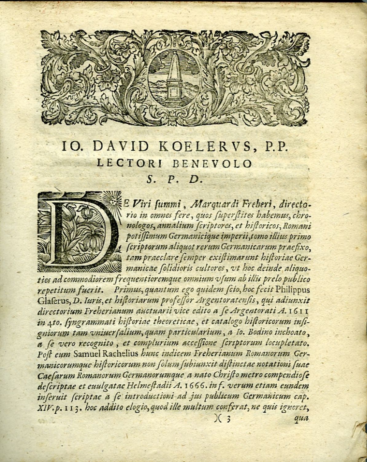 MARQVARDI FREHERI DIRECTORIVM IN OMNES FERE, QVOS SVPERSTITES HABEMVS CHRONOLOGOS, ANNALIVM SCRIPTORES ET HISTORICOS POTISSIMVM ROMANI GERMANICIQVE IMPERII. RECOGNOVIT ET AVXIT IO. DAVID KOELERVS, HIST. ET POLIT. PP. ALTORF. ET VNIV. BIBLIOTHECARIVS IN VSVM AVDIRORVM. ACCESSIT CASPARIS SAGITTARII, PP. IENENS. DISSERTATIVNCVLA DE PRAECIPVIS SCRIPTORIBVS HISTORIAE GERMANICAE.