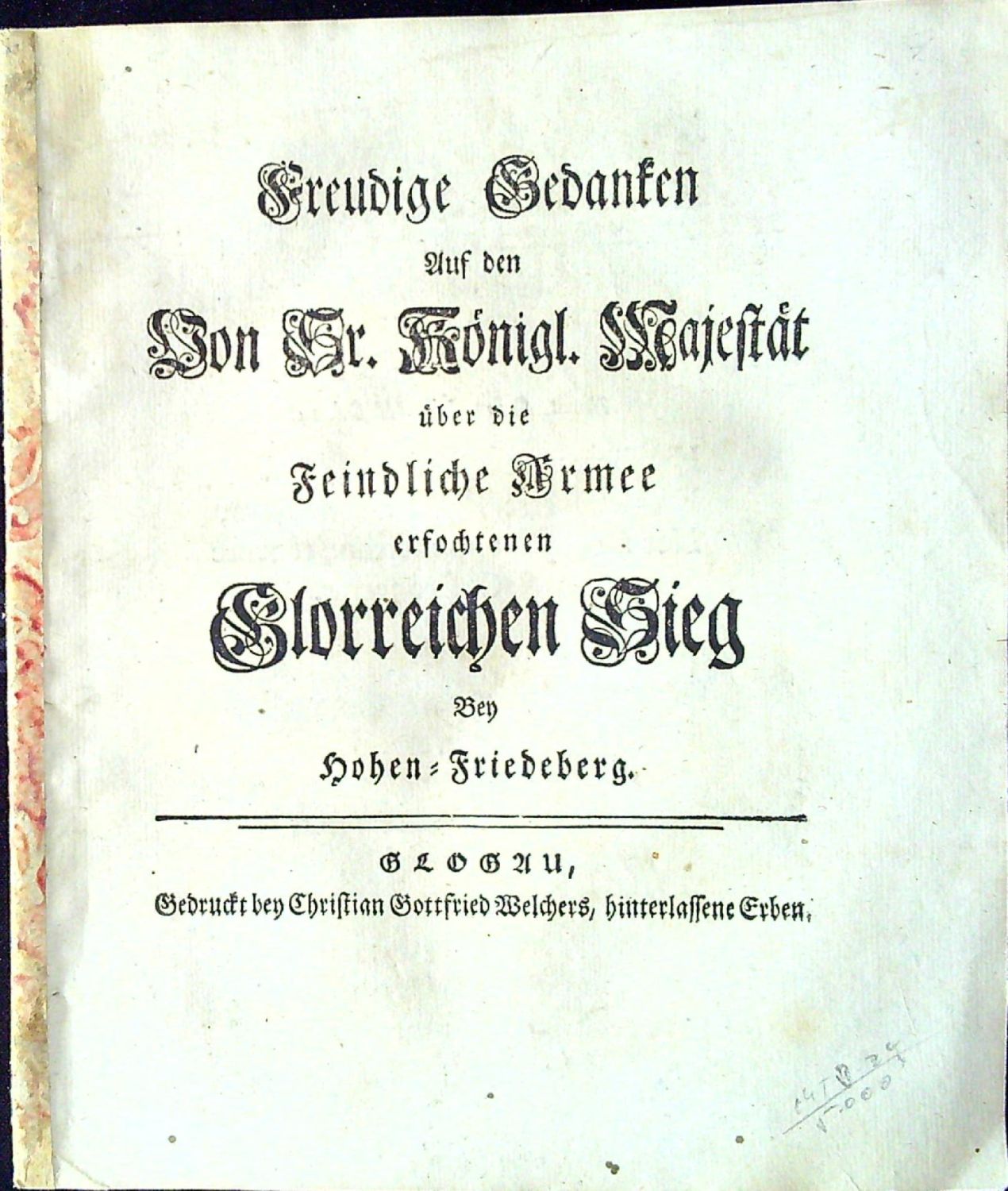 Freudige Gedanken Auf den Von Sr. Königl. Majestät über die Feindliche Armee erfochtenen Glorreichen Sieg Bey Hohen=Friedeberg.e
