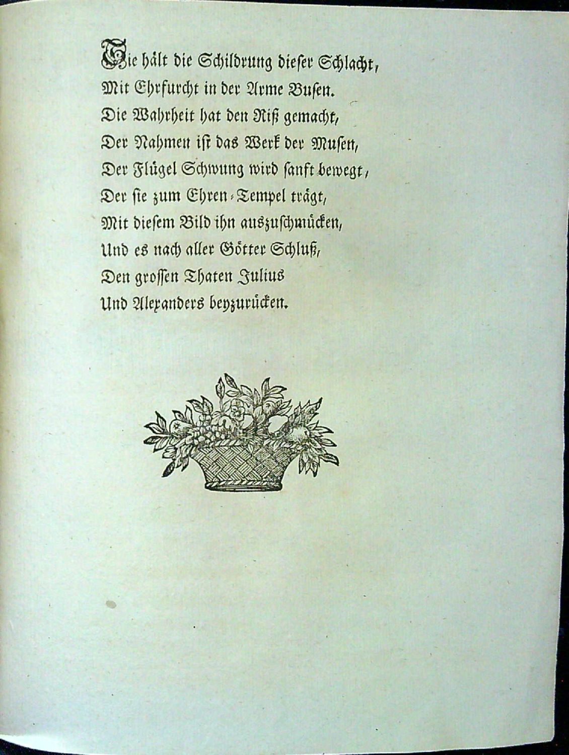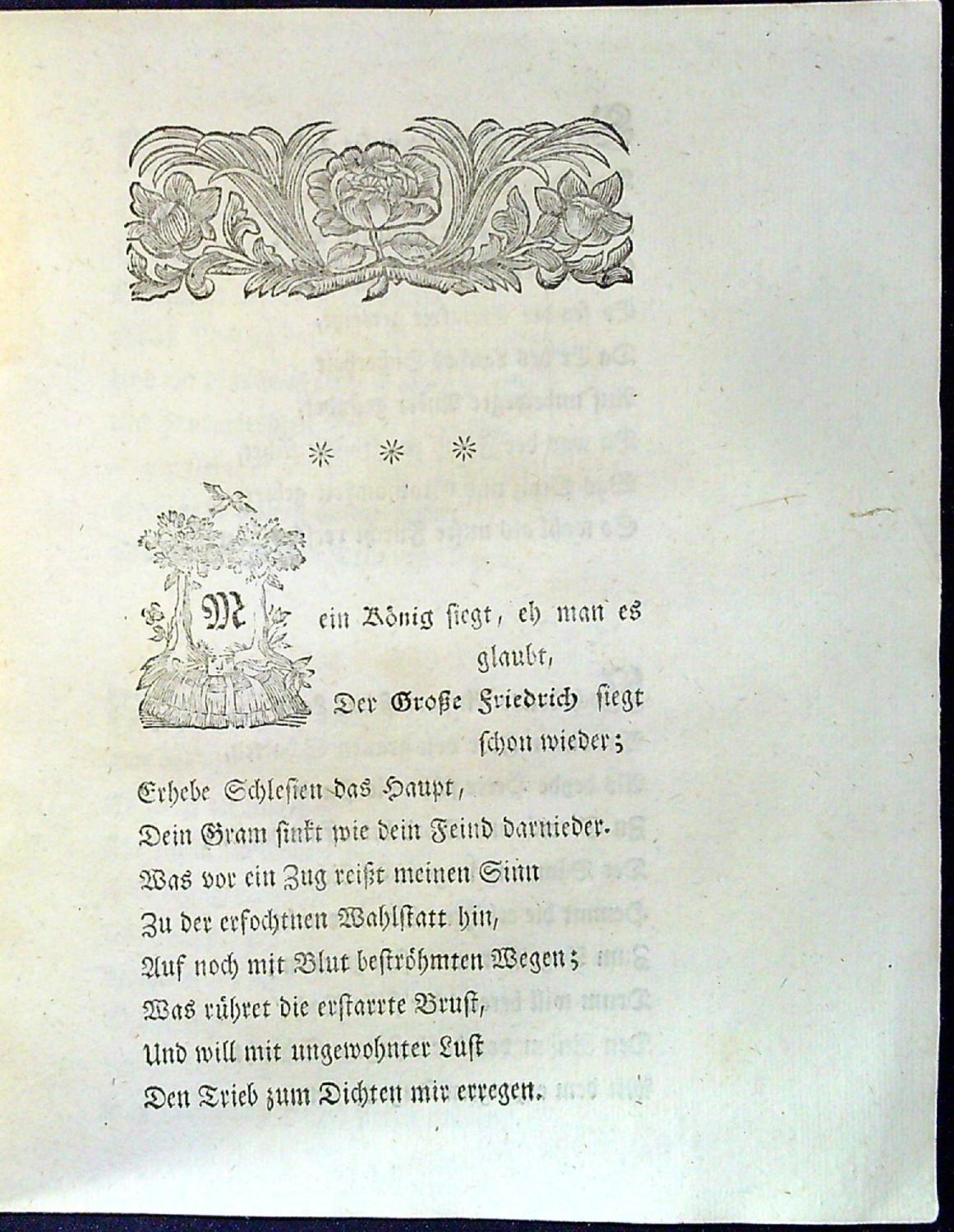 Tištěno švabachem, latinské motto na rubu tit. listu a latinské poznámky pod čarou antikvou, vstupní pásový vlys, koncová viněta, tučně tištěné iniciálky, vstupní zasazená do ilustrace. - Původní brožura přes hřbet přelepená dobou pap. páskou z mramorovaného papíru.<br>Anonymní autor ve 23 nečíslovaných slokách oslavuje vítězství pruského krále Friedricha II. nad Marií Terezií v bitvě u Hohen=Friedebergu (Dobromierz v Dolním Slezsku), která proběhla 4.6. 1745 a skončila drtivou porážkou rakousko-saského vojska.