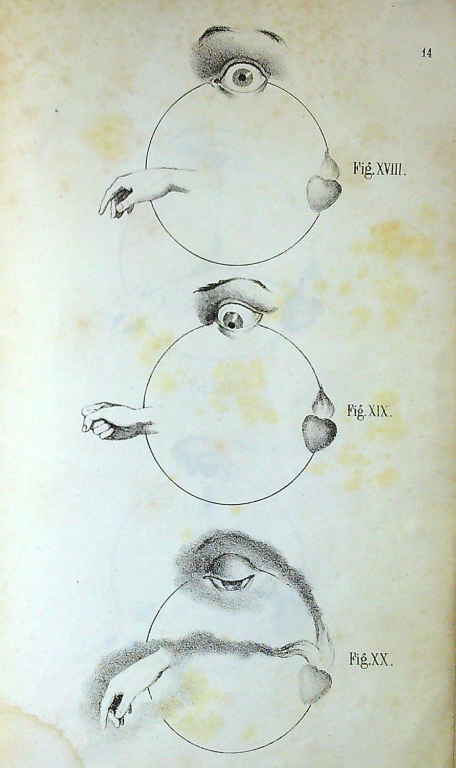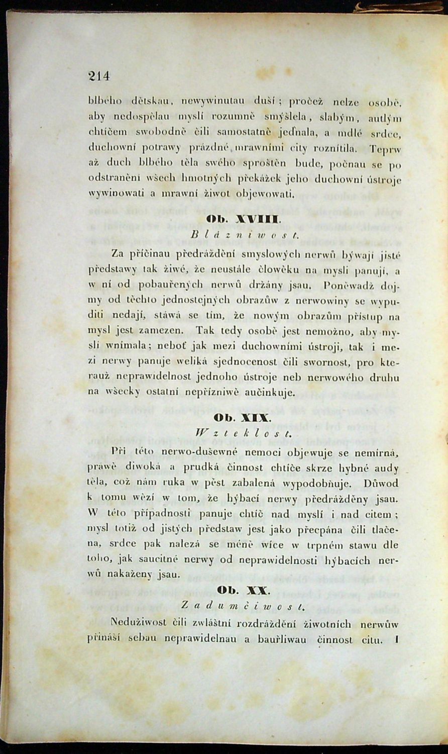 Jungmann VI,1168; Doucha str. 47<br> Kartonová vazba s deskami potaženými mramor. papírem. Pokryv desek lehce zvlněný, na zadní desce cca v jedné polovině zčásti sedřený, při horním okraji hřbetu nalepeny pap. štítky, hřbet u přední desky naprasklý, titulní list zahnědlý, v textu tu a tam světlé hnědé skvrnky a mapy, na tabulích též, výrazněji na poslední. Místy oslí uši, okraji několika stran zašpiněné.Na tit. listu podpis Jiřího Šalamouna tužkou a staré razítko majitele dřívějšího "W. Křikawa".<br>Velmi kuriosní práce o člověku, jeho duši a stavech mysli s vysvětlujícími 23 obrázky na 16 tabulích.<br>Václav Frost (1814 Nosalov - 1865 Konojedy), pedagog hluchoněmých. Nejprve působil jako kaplan ve Mšeně, později byl ředitelem pražského ústavu hluchoněmých. Roku 1848 byl poslancem říšského sněmu.<br>Václav Koťátko (1810 Jenišovice u Turnova - 28. 10. 1876 Praha), pedagog hluchoněmých a lidumil. Působil jako kooperátor ve Mšeně, po odchodu V. Frosta do Prahy se zabýval výchovou tamních hluchoněmých. Od roku 1841 učitelem, později ředitelem ústavu pro hluchoněmé v Praze. Zasloužil se o zavedení českého vyučování hluchoněmých. Spolupodílel se na založení ústavů pro hluchoněmé v Hradci Králové a v Českých Budějovicích. Autor několika učebnic pro hluchoněmé.