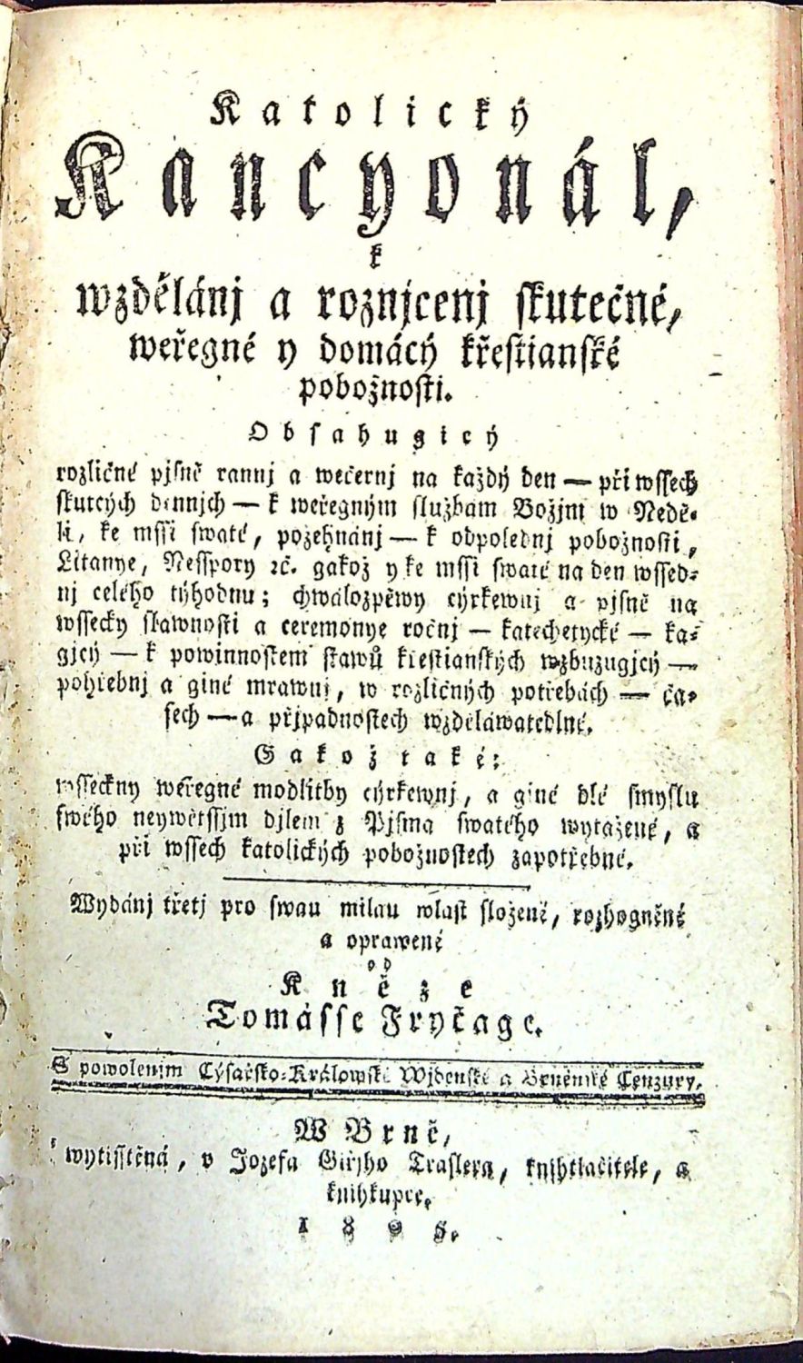 Katolický Kancyonál, k wzdělánj a roznjcenj skutečné, weřegné y domácý křestianské pobožnosti. Obsahugicý rozličné pjsně rannj a wečernj na každý den - při wssech skutcých dennjch - k weřegným službam Božjm w Neděli, ke mssi swaté, požehnánj - k odpolednj pobožnosti, Litanye, Nesspory etc. gakož y ke mssi swaté na den wssednj celého týhodnu; ......
