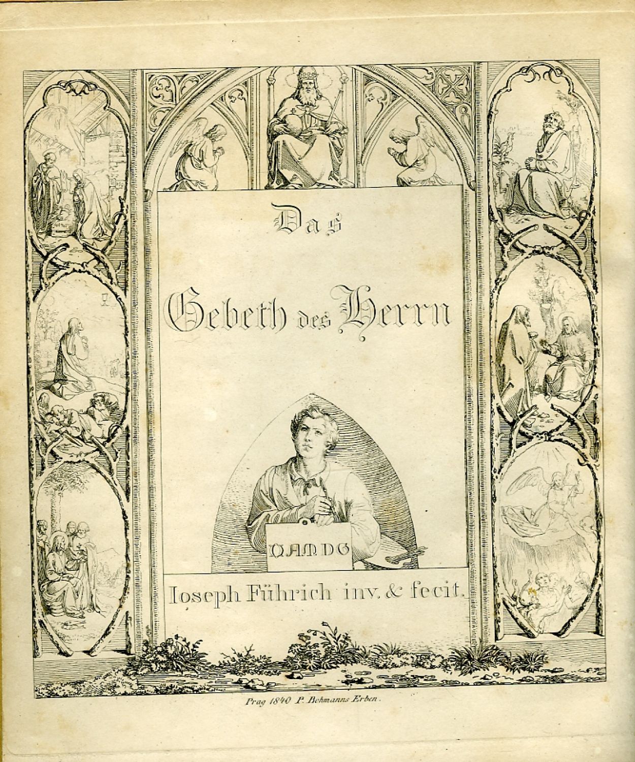 Listy s doprovodným textem při horním okraji oříznuté (nezasahuje do textu), papír zahnědlý, místy drobné hnědé skvrnky. Kartonová vazba potažená mramorovaným papírem s koženým hřbetem, kůže ve hřbetu místy odřená, na přední desce nalepený původní pap. štítek z názvem a nakl. údaji. Vazba je dílem vídeňského knihaře Theodora Mümmlera. Na přední předsádce rkp. poznámky vztahující se k vydání cyklu. Z němčiny do francouzštiny přeložil Demarteau. Dílo vyšlo v prvém vydání německy roku 1826 v Praze pod názvem "Vater unser", druhé vydání roku 1840 a paralelně s ním francouzské.<br>Josef Führich (1800 Chrastava - 1876 Vídeň), malíř a grafik, od roku 1840 působil jako profesor na Akademii výtvarných umění ve Vídni, roku 1861 byl povýšen do šlechtického stavu.<br> Anton Müller (1792 Osečná u Mimoně - 1843 Praha), estetik a kritik, od roku 1819 působil na universitě v Innsbrucku jako profesor klasických jazyků a estetiky, po přímluvě hraběte Chotka od roku 1823 na pražské universitě jako nástupce Dambeckův, přednášel dějiny filosofie, estetiku a etiku na katedře krásných věd. Mezi jeho posluchače patřil i malíř Josef Führich, jehož několik výtvarných prací doprovodil textem.