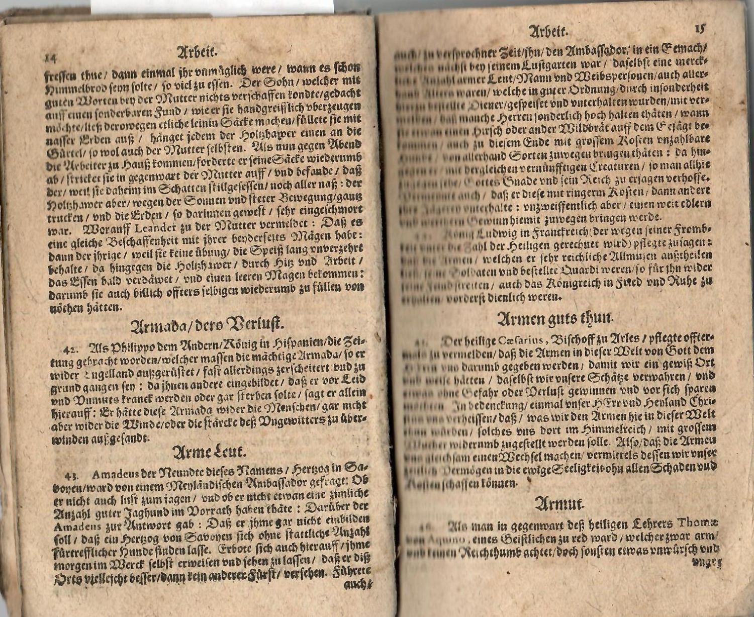 Goedeke III, 265,6; Hayn-Gotendorf I, 549; Holzman-Bohatta II, 2683<br>Červeno-černě tištěný titulní list s drobnou vinětou, viněty, pásové vlysy, vstupní iniciála propletená úponky ve výši 4 řádků, živá záhlaví, fraktura, latinská jména a slova antikvou. <br>Dobová kartonová vazba s pergamenovým pokryvem, pokryv zašpiněný a odřený, při okrajích potrhaný a zčásti chybící, přes hřbet přelepen pap. štítek s rkp. názvem a datací tisku knihy, strana 439-440 při horním vnějším okraji zčásti utržená, v textu tu a tam stopy způsobené červotočem, papír zahnědlý, místy hnědé skvrnky, poslední tři listy rejstříku při vnějším okraji roztřepené a potrhané. Knižní blok zčásti rozvolněný. Chybí frontispis<br>Louis Garon (1574 Ženeva - 1631), byl francouzský spisovatel. Nabízená práce vyšla poprvé roku 1600 pod názvem "Le Chasse-ennuy" v Lyonu. Kniha obsahuje téměř dva tisíce anekdot a příběhů, které jsou tematicky řazené a jednotlivě číslované. Autor čerpal z děl i mnoha jiných autorů napříč věky, lidových vyprávění, hospodských řečí .... <br>Velmi vzácné a raritní, první německé vydání klasické "Schwankbuch".