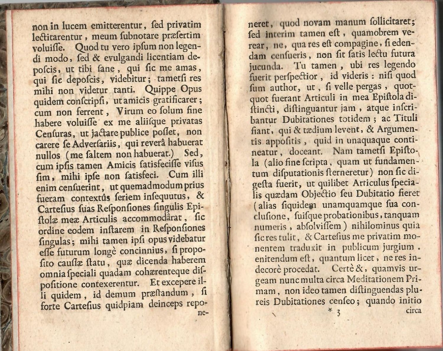 Signatury, stránkové kustody, živá záhlaví, červeno-černě tištěný titulní list s vinětou. Iniciály ne rostlinném pozadí ve výši 6-7 řádků, tučně tištěné versálky ve výši 2-3 řádků, dřevořezové vlysy a viněty, jednoduché linky, obsah tištěný ve dvou sloupcích.<br>Kartonová vazba potažená mramorovaným papírem s plátěným hřbetem s ozdobnými zlacenými linkami a štítkem s tlačeným a zlaceným názvem z počátku 18. století. Hřbet lehce odřený, červeně barvené ořízky.<br>Pierre Gassendi (1592-1655), francouzský filosof, kněz, matematik a astronom, čelní představitel skupiny svobodomyslných intelektuálů v Paříži. V nabízené práce se Gassendi kriticky vymezuje vůči Descartově knize "Principy filosofie", která byla poprvé vydána v Amsterodamu roku 1644.<br>1 přívazek Vries, Gerard de: De R. Cartesii Meditationibus a Petro Gassendo impugnatis Dissertatiuncula historico-philosophica. Utrecht, Willelm de Water, 1691, 115-[I]stran, vstupní vlys, živá záhlaví, tištěné poznámky po stranách.<br>Gerard de Vries (1648-1705) byl profesorem filosofie a teologie v Utrechtu a odpůrcem kartesianismu.<br>Dritte Ausgabe, Pappband der Zeit mit marmoriertem Papierüberzug, goldverziertem Leinenrücken und Rückenschild. Allseitiger Rotschnitt. Rot-schwarzer Titel. Vord. Vorsätze und Kopfschnitt beschmutz, sonst nur wenig braunbzw. feuchtigkeitsfleckig.<r>Vorliegende umfangreiche Descartes-Kritik erschien erstmals 1644 in Amsterdam und erhält Gassendis Erwiderung zur Antwort René Descartes (lat. Renatus Cartesius) auf die Einwände Gassendis.<br>+ Beig.: Vries, Gerard de: De R. Cartesii Meditationibus a Petro Gassendo impugnatis Dissertatiuncula historici-philosophica. Utrecht, Willelm de Water, 1691, 115-[I]S. 2 Bl. mit kl. Fehlstelle am weissen Rand, sonst gut erhalten.<br>Gerard de Vries (1648-1705) war Utrechter Professor der Philosophie und Theologie, Gegner des Cartesianismus.