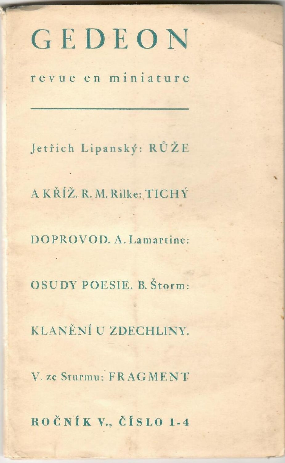 Jeden ze 120 vydaných exemplářů, redigoval Jetřich Lipanský, graficky upravil Břetislav Štorm, první číslo má samostatný titulní list "Jetřch Lipanský: Růže a kříž", další tři čísla jsou pouze na 15 stranách. Na přední předsádce podpis perem Lipanského. Původní pap. obálka s chlopněmi, ve které je volně vložený složený knižní blok. Přiloženo: Gedeon roč. I, č. 3,6; roč. II, čísla 1-3; ročník III, č. 1,3-4; roč. IV, číslo 1. (všechna čísla jsou v původních sešitech).<br>Jetřich Lipanský = František Mastík (1900 Veselí u Pardubic - 1972 Lima, Peru), katolický kněz řádu sv. Benediktina v Praze, básník, spisovatel a literární historik publikující ve 20. a 30. letech 20. stol., spolupracovník četných časopisů (Vopravil str. 923).