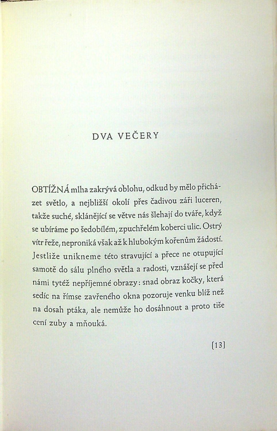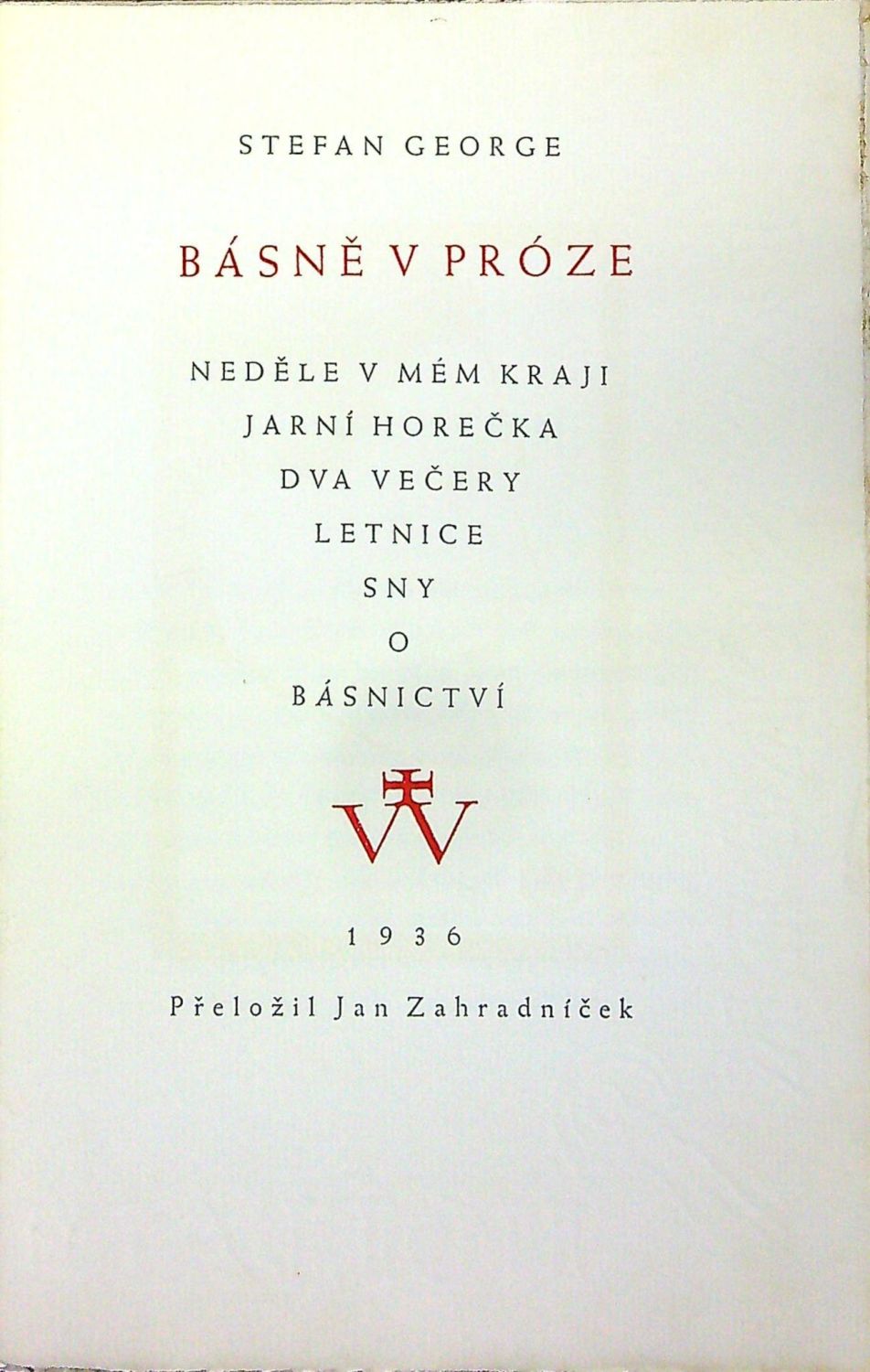 Ex. č. 21 ze 100 vydaných a vytištěných v knihtiskárně V. Vokolka a syna jako neprodejný, soukromý tisk. Tištěno na ručním hollandu Pannekoek, dvoubarevně tištěný tit. list, v tiráži předtištěno "jest vytištěn a věnován" a Vokolkem ručně dopsáno "panu Matěji Bartoníčkovi". Přeložil Jan Zahradníček. V knize volně vloženy dva portréty S. George a brožurka o šesti listech s úvodním textem Arne Nováka o S. Georgemu a šesti jeho básněmi v překladu Václava Renče.