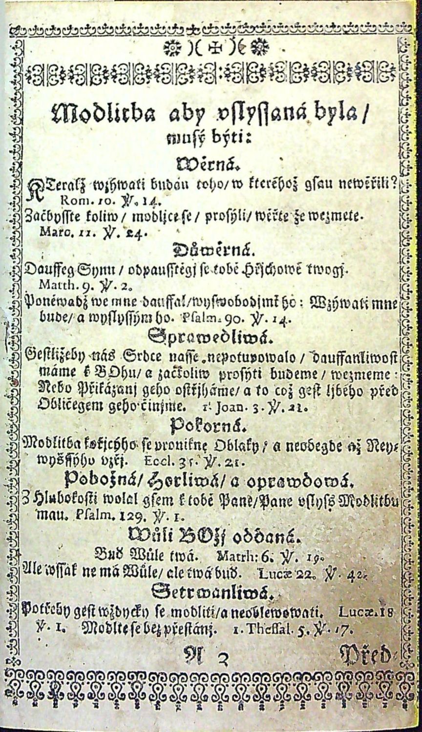 Knihopis 2683<br>Tištěno švabachem, živá záhlaví od sazby oddělená jednoduchou linkou, text olemovaný rámečkem z ornamentů, iniciály propletené úponky zalomené do výše 2-4 řádků., plné iniciály na ornamentálním pozadsí zalomené do výše 4-6 řádků, ozdobné lišty z ornamentů, viněty, první část knihy se skládá z 12 dílů. Samostatně paginovaná druhá část s titulním listem "Welmi Užitečné A Potěssytedlné Rozmlauwánj/ O weliké Platnost a Vžitku Austnjch Modliteb/ Stůro na wětssým Djle z Zgewenj SS. Geretrudy a Mechtyldy. wytažené A Těmto Modlitbám, k obwzlásstnjmu Srdce Potěssenj. wssem Pobožným a BOhabogjcým Křestianům/ připogené". <br>Kožená vazba z 19. století, na přední desce tlačený kříž protknutý paprsky, hřbet dělený zlacenou a tlačenou lištou do čtyř polí, žlutě barvené ořízky. Titulní list nahrazen faksimilií.