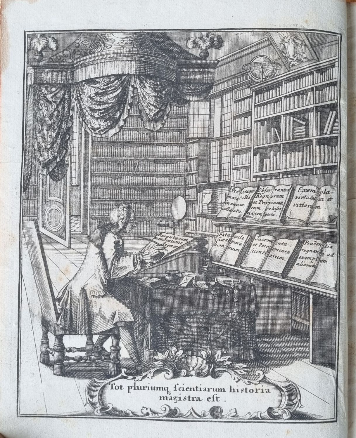 | Ilustrace: | Ve front. celostr. mědirytina s vyobrazením učence v knihovně a s nápisem "Tot pluriumque scientarium historia magistra est". |