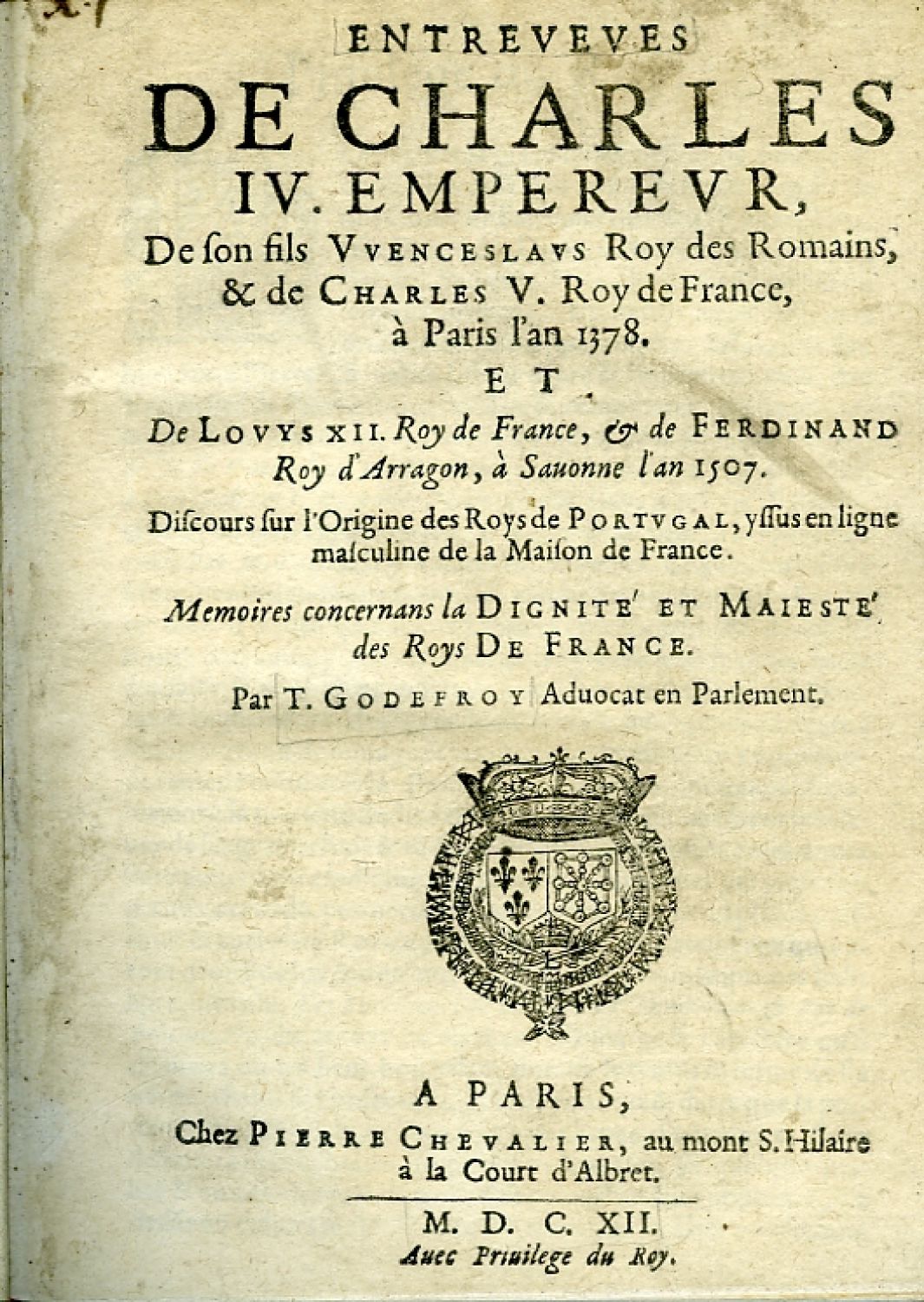 ENTREVEVES DE CHARLES IV. EMPEREVR, De son fils VVENCESLAVS Roy des Romains, & de CHARLES V. Roy de France, à Paris l´an 1378. ET De LOVYS XII. Roy de France, & de FERDINAND Roy d´Arragon, à Sauonne l´an 1507. Discours sur l´Origine des Roys de PORTVGAL, yssus en ligne masculine de la Maison de France. Memoires concernans la DIGNITÉ et MAIESTÉ des Roys DE FRANCE.