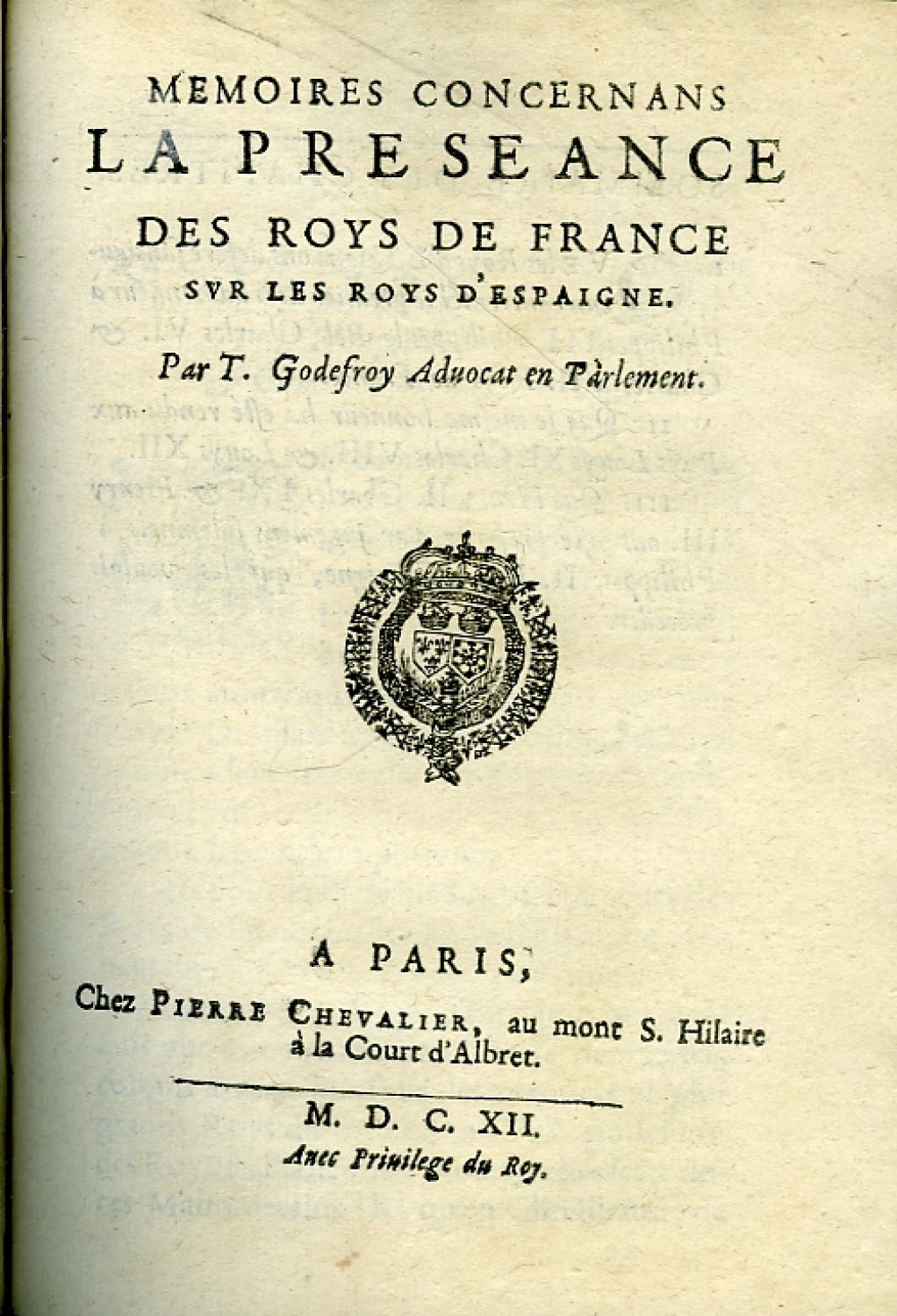 Tři části separátně paginované a s vlastními titulními listy, dřevořezové tit. viněty s královskou korunou, konturové iniciály na rostlinném pozadí zalomené do výše 3-7 řádků, pásové vlysy, na str. 46 prvé části koncová viněta. Živá záhlaví, tištěné poznámky po stranách, místy tisk kursivou. - Kartonová vazba potažená škrobovým papírem, ve hřbetu vínově červený kožený štítek s tlačeným a zlaceným názvem, ručně šitý kapitálek.<br>Théodore Godefroy (14.7.1580 Ženeva - 16.10.1649 Münster) byl francouzský historiograf a diplomat, vyrůstal v kalvinistickém prostředí a později přestoupil na katolickou víru. Byl členem francouzské delegace, která se podílela na přípravě evropské mírové dohody v Münsteru a po jejímž uzavření zde zůstal jako francouzský vyslanec.