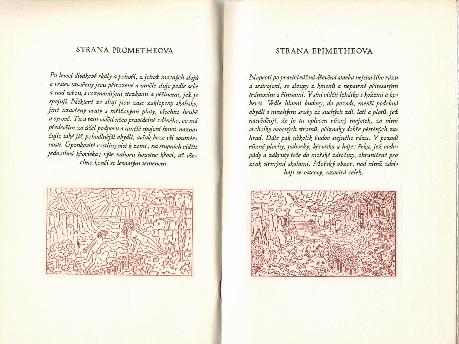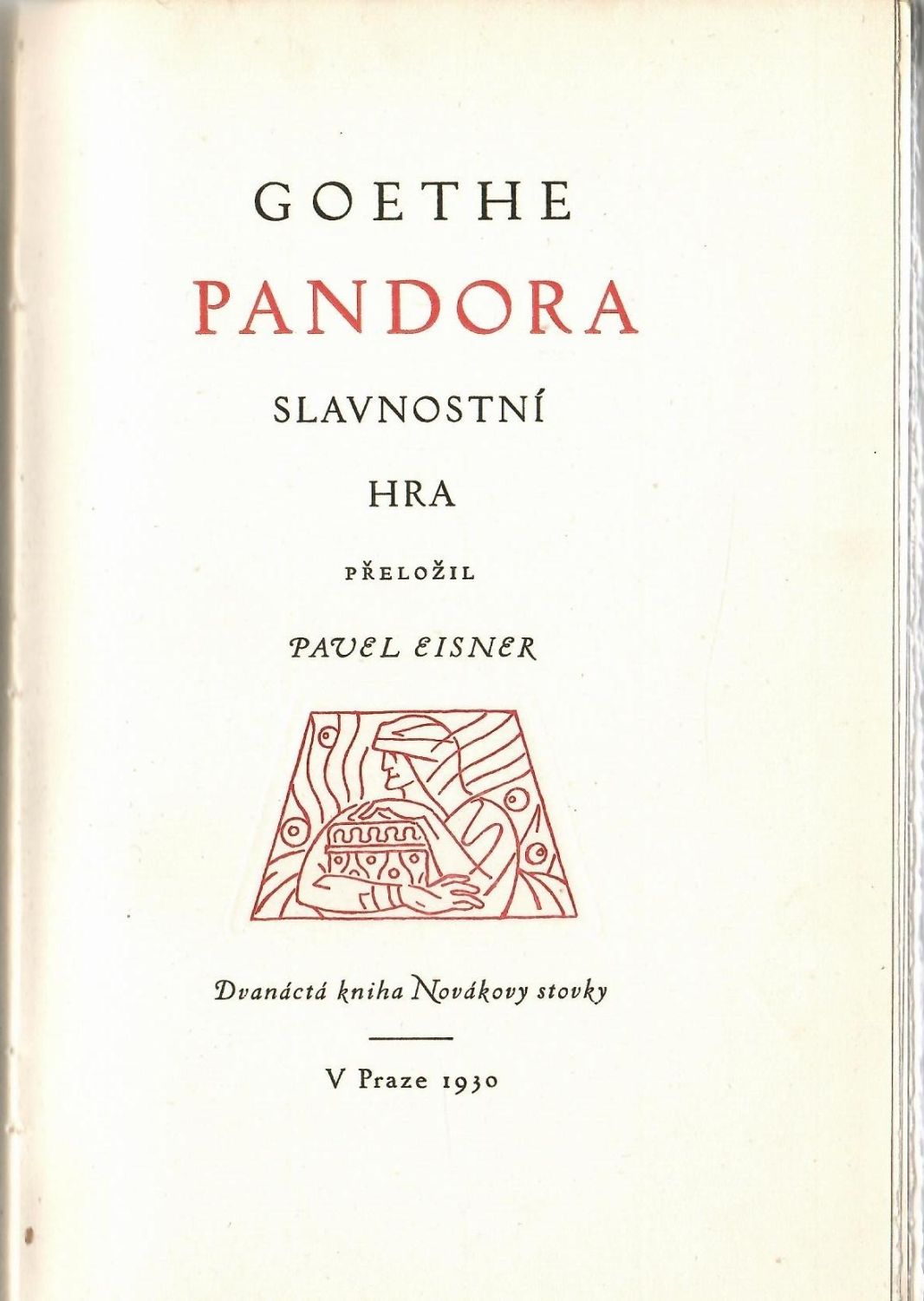 Ex. č. 80 ze 130 vydaných, věsmes číslovaných výtisků, tištěných na holandském ručním papíru Pannekoek, upravil Method Kaláb, dvoubarevně tištěný tit. list s leptanou vinětou, v textu tři drobné, červené, leptané ilustrace Jana Konůpka. Původní kartonová vazba s pergamen. hřbetem, v horní části přední desky původní pap. štítek s názvem, v horní části hřbetu tlačený a zlacený název, šitý kapitálek. Přeložil a doslovem opatřil Pavel Eisner.