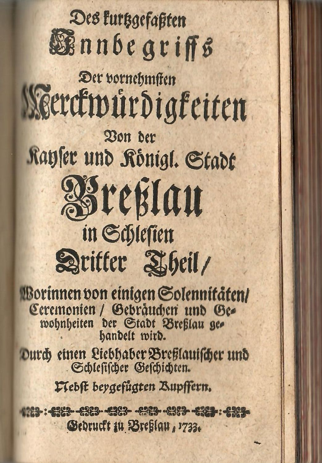Tištěno švabachem, latinský text antikvou, arabská paginace stran uprostřed horního okraje v kulatých závorkách mezi drobnými lístky od sazby oddělená jednoduchou linkou, vstupní pásové vlysy, koncové viněty. Tři samostatné titulní listy. I. díl "Von deren Erbauung, Erweiterung und Bevestigung, dann von denen darinn = und ausserhalb derselben befindlichen Fürstlichen Gestisstern, Klöstern, Pfarr=Kirchen und Capellen, deren Fundirung und Erbauung samt andern mehreren curiösen Nachrichten, alles aus bewährten Autoribus, Documenten, .... II. díl: "Worinnen dasjenige, wasa im ersten Theile entweder gar nict, oder unvollkommen stehet, naceholet wird, Durc einen Liebhaber Bresslanischer und Schlesischer Geschichten", III. díl: "Worinnen von einigen Solennitäten, Ceremonien, Gebräuchen und Gewohnheiten der Stadt Bresslau gehandelt wird".<br>Dobová vazba s kartonovými deskami potaženými olejovým papírem, peramen. hřbet a nárožnice, červeně barvené ořízky. Vazba mírně odřená, pergamen ve hřbetu lehce zkrabatělý, na tit. listu prvnío dílo perem začerněný vlastnický rkp. přípis, dvě rytiny při okraji natržené. Chybí 4. díl, který vyšel o rok později jako dodatek k dílům již vydaným.<br>Daniel Gomolcke či Gomolcky (možná Homolka) vratislavský historik 18. století. Čeněk Zíbrt v Českém lidu (XIII., str. 273) publikoval jednu z vratislavských ženských zábav, kterou přeložil z nabízeného díla. Bývala součástí střeleckých slavností. Devět až deset žen se účastnilo běhu o závod, cílem byla tyč, nahoře upravená na způsob kříže. Uprostřed byl ženský kožich, naoře čepice, po stranách střevíce a punčochy, rukávník a drnkačka. Během běhu žen šašek s plácačkou tropil různé žertíky. Vítězka dostala kožich, druhá čepici, třetí rukávník, ... a poslední drnkačku. Závod je v knize vyobrazený na rytině ve III. dílu mezi str. 182-183.
