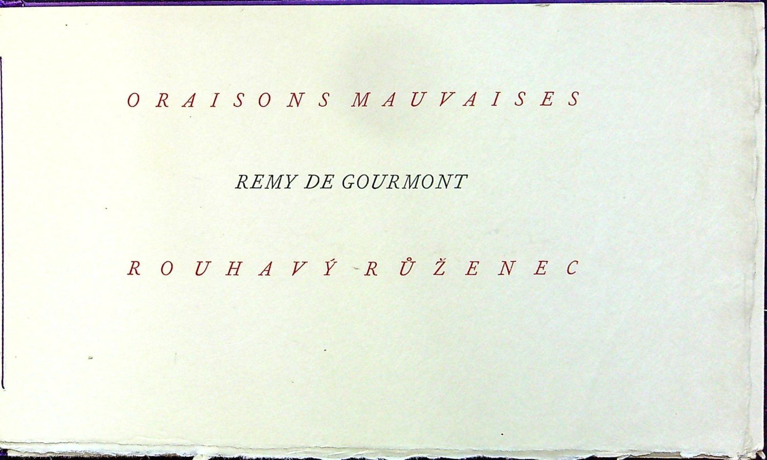 Ex. č. 17 z 25 výtisků tištěných na pravém japanu, dvoubarevně, versálkami tištěný titulní list, zčásti též versálkami tištěná tiráž, plné, písmem Fournierovým červeně tištěné iniciály ve volném prostoru. Za vedení Karla Dyrynka vytiskla Státní tiskárna, upravil a původním, tužkou podepsaným leptem ve front. vyzdobil František Kobliha. Dvojjazyčný text: na levé straně francouzský originál, na straně pravé český překlad Jindřicha Hořejšího. Studii o autorovi napsal Jiří Karásek ze Lvovic, v tiráži jeho podpis červeným perem. Původní kartonová vazba zabalená ve fialovém papíru (původní adjustace), knižní blok šitý nití téže barvy; původní ochranné kartonové pouzdro s pap. štítkem ve hřbetu částečně vybledlé. Rozměr vazby 145 x 240 mm.