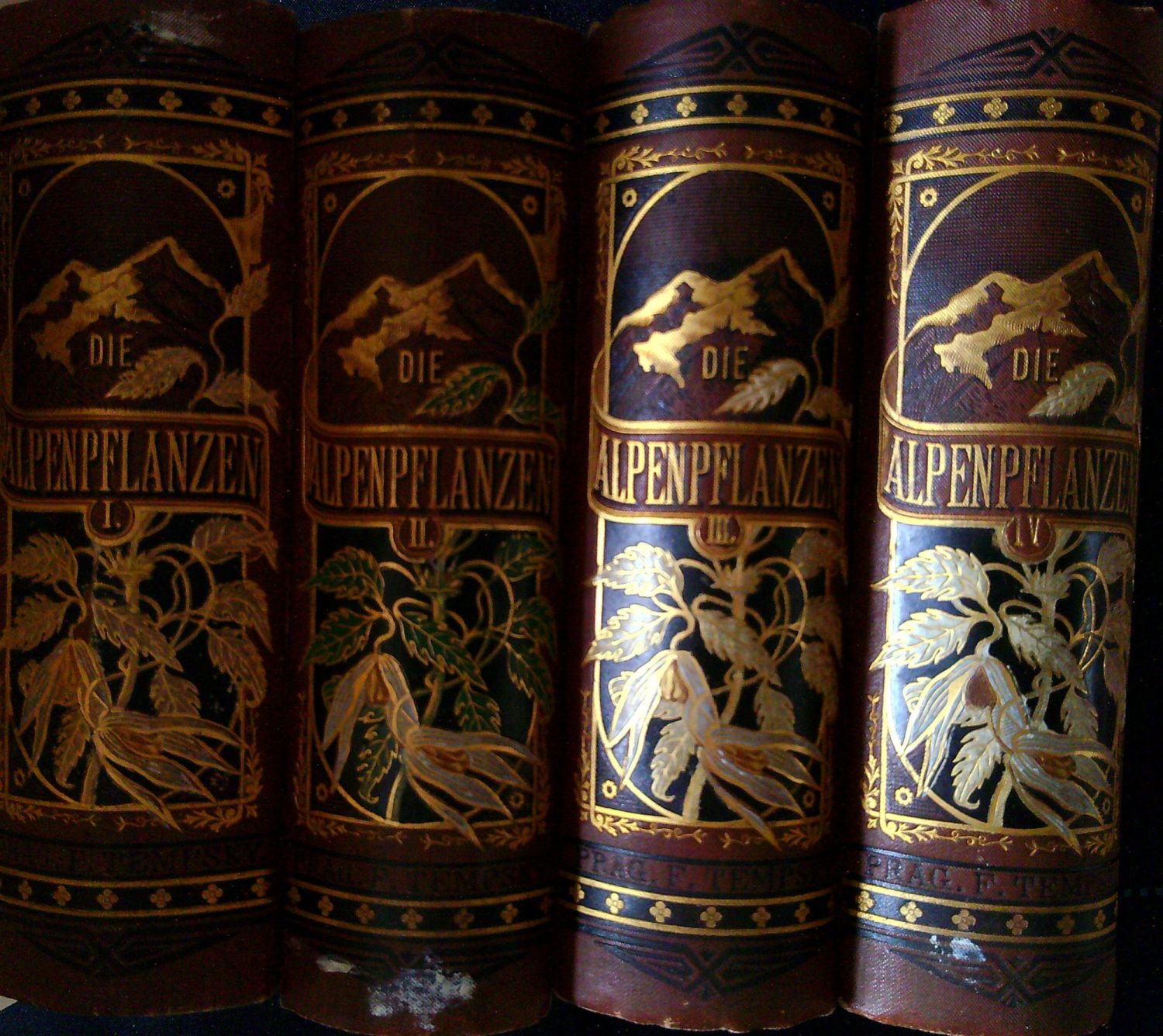 Nissen BBI str. 169, č. 1826<br>Ve všech 4 dílech chromolitografické front. a 401 barevných chromolit. tabulí s vyobrazením alpské květeny. Tabule byly tištěny dvorním litografem A. Haasem v Praze pro nakladatele Tempského. V každém svazku jsou tabule číslovány 1-100 (ve svazku prvním je dvakrát číslo 85).<br>Původní plátěná nakladatelská "lipská vazba" z díly vídeňského knihaře H. Scheibeho. Na předních deskách lisované zrcadlo, které je uvnitř rámu rozčleněno do tří polí, v horním poli zlacený název s barvenou květinou, v poli prostředním zlacené alpské panorama, v poli spodním barevné květy. Barevným ornamentem zdobené ořízky. Na všech titulních listech vlastnické razítko profesora Karla Domina. Titulní list 3. dílu na rubu ve spodní půli podlepený (na líci původně vydřené místo u jména Petraschova), tabule číslo 96 u IV. dílu uvolněná z knižního bloku. <br>Profesor Karel Domin (4.5. 1882 Kutná Hora - 10.6. 1953 Praha), významný český botanik, vysokoškolský profesor a politik. V roce 1933-34 byl rektorem University Karlovy.