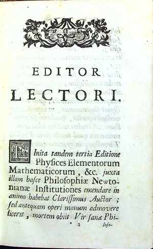 Jacob Willem Gravesande (26.9. 1688 ´s-Hertogenbosch - 28.2. 1742 Leiden) nizozemský astronom, matematik a přírodní filosof. Profesor matematiky, astronomie a filosofie na uviversitě v Leidenu. Propagátor myšlenek I. Newtona. Zabýval se především experimentálním měřením kinetické energie a experimentální demonstrací zákonů klasické mechaniky. Nabízená kniha vyšla poprvé v latinském jazyce roku 1723 v Leidenu.