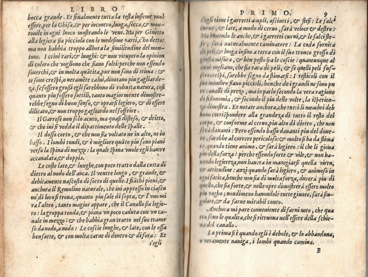 Adams I, G1268 (uvádí vydání 1553 a 1564); Graesse III, str 160 (uvádí vydání 1571).<br> Tištěno kursivou, živá záhlaví, na tit. listu viněta a malý ozdobný rámeček, konturové iniciály ve dvojitém jednoduchém rámečku na ilustrativním pozadí zalomené do výše 7-9 řádků.<br>Dobová pergamenová vazba, lehce zkrabatělá, na rubu přední předsádky stará knih. čísla perem, na tit. listu dvě různá stará proven. razítka, na některých listech při horním okraji (od středu ke hřbetu) světle hnědé mapy od vlhkosti, na foliu 96 při spodním okraji nepravidelně chybící okraj papíru.<br>Federico Grisone (1507 Neapol - 1570 Neapol) neapolský šlechtic a jeden z prvních mistrů drezury a dvorního ježdění, ve své době označovaný jako "mistr jezdeckého umění". Jeho kniha je první knihou na toto téma, která vyšla v ranně novověké Evropě. Jeho "Pravidla jezdectví" vyšly poprvé roku 1550 v Neapoli a dílo se stalo velikým bestsellerem, mezi lety 1550 až 1623 vyšlo celkem 23 italských, 15 francouzských, 7 německých, 6 anglických a jedno španělské vydání. Jeho tréninkové metody velmi ovlivnily výcvik koní ve své době, dnes jsou jeho metody kritizovány pro své drsné zacházení s koňmi. Vynalezl také několik různých druhů udidel, které jsou v knize též reprodukovány.