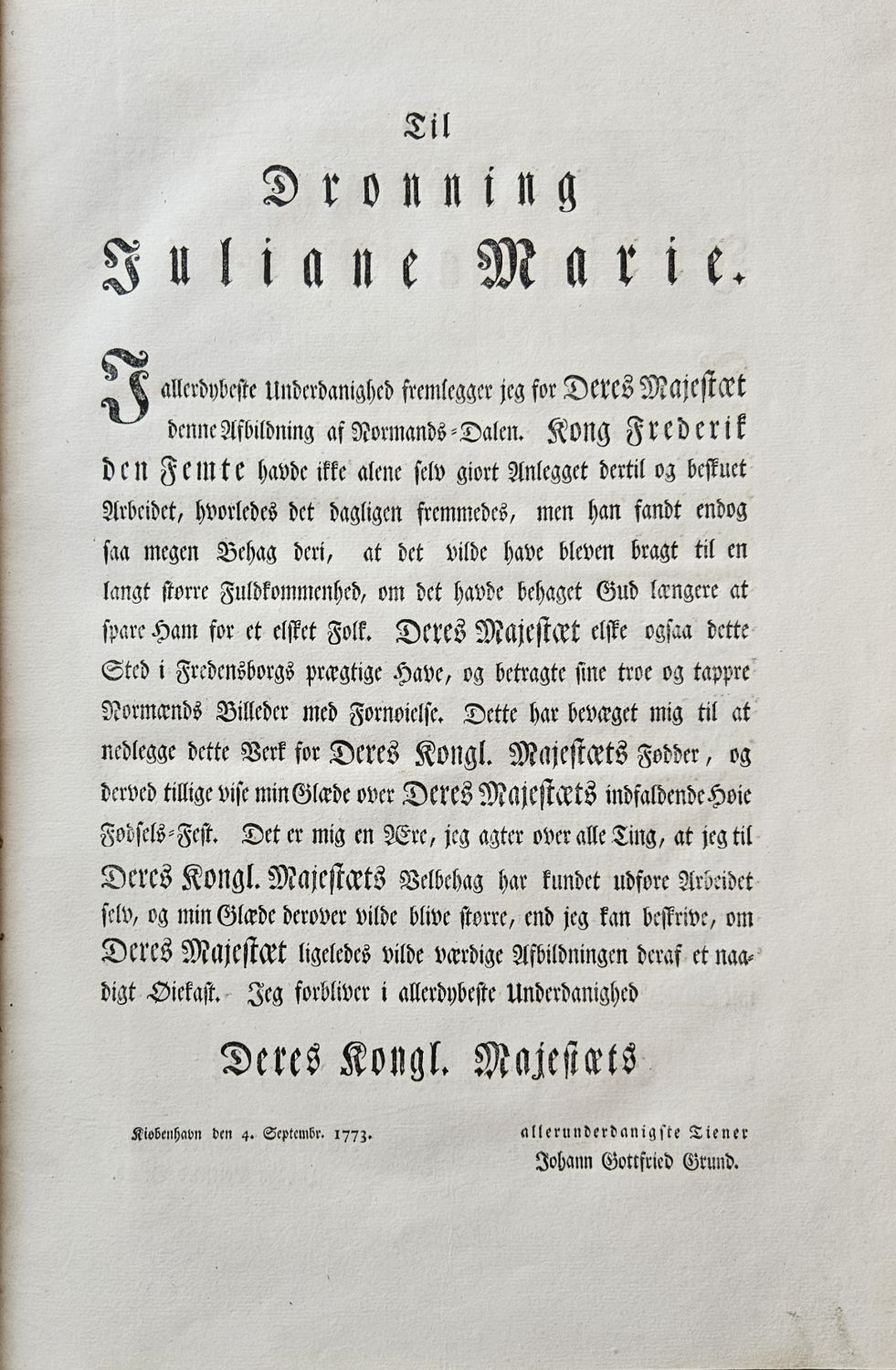 Text tištěný dánsky a německy, v záhlaví 5 strany mědirytinový vlys, tučně tištěné iniciálky ve výši 2 řádků, uprostřed horního okraje stran mizící tyč z ornamentů od sazby oddělená dvojitou linkou, na konci textu ozdobné tyče. Strana 5 až 16 tištěna ve dvou sloupcích (vysvětlující text k rytinám), sloupec levý v dánštině, pravý v němčině.<br>Dobová kartonová vazba (433 x 295 mm), hřbet dělený jednoduchou zlacenou linkou na 7 polí, ve druhém poli dobový vínově červený kožený štítek s tlačeným a zlaceným názvem. Vazba místy odřená, naražené rohy, titulní list zahnědlý.<br>Zámek Fredensborg Zámek Míru) je cca 30 kilometrů od Kodaně a patří mezi nekrásnější ukázky severského baroka, zámek nechal postavit dánský král Frederik IV. v letech 1720-1722 v duchu italského baroka a název má připomínat vítězství Dánska nad Švédskem a uzavření míru v roce 1721, kterým vleklý konflikt skončil. K zámku přiléhají rozsáhlé zahrady a jedna z nich nese jméno "Norské údolí", ve které se nachází 68 replik Grundových soch (originály byly přemístěny do pivovaru Christiana IV. v Kodani). Nedaleko zámku se nachází slavné muzeum moderního umění "Louisiana Museum of Modern Art".<br>Johann Gottfried Grund (27.4. 1733 Míšeň - 20.6+. 1796 Kodaň) německo-dánský sochař, od roku 1756 žil v Kodani a roku 1766 byl jmenován dvorním sochařem.