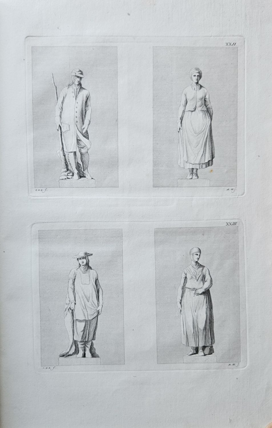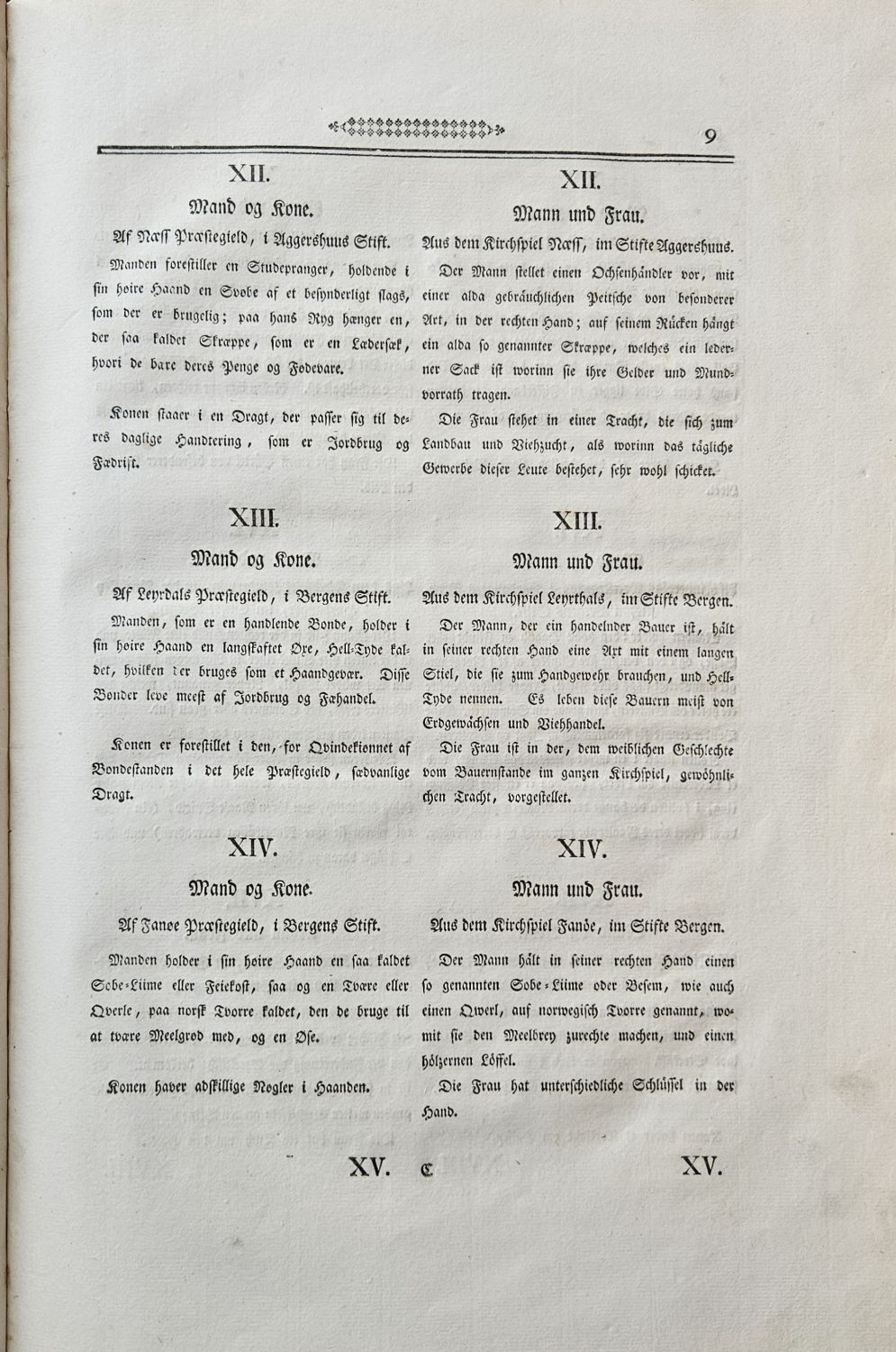 | Ilustrace: | Na 16 mědiryt. přílohách 32 vyobrazení různých soch norských a faerských rybářů, sedláků a jejich ženských protějšků v různých národních krojích (na první příloze obelisk), na 17 příloze, která je přes dvě strany vyobrazeno "Norské údolí", park u zámku, ve kterém se sochy nacházejí. Dle soch J. G. Grunda vyryl A. Heckel. |