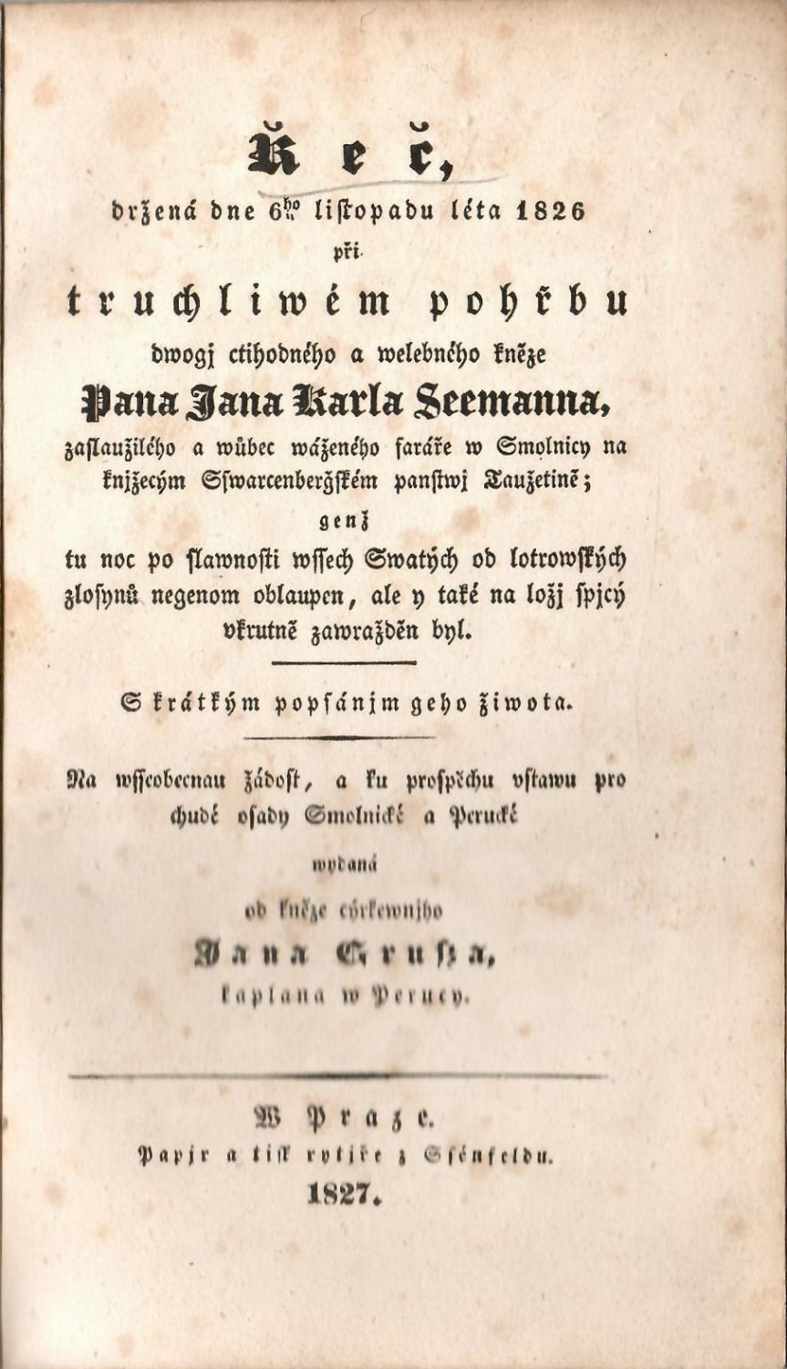 Řeč držená dne 6ho listopadu léta 1826 při truchliwém pořbu dwogj ctihodného a welebného kněze Pana Jana Karla Seemanna, zaslaužiléo a wůbec wáženéo faráře w Smolnicy na knjžecým Sswarcenbergském panstwj Taužetině; enž tu noc po slawnosti wssec Swatýc od lotrowskýc zlosynů negenom oblaupen, ale y také na ložj spjcý vkrutně zawražděn byl. S krátkým popsánjm geho žiwota. Na wsseobecnau žádost, a ku prospěchu vstawu pro chudé osady Smelnické a Perucké wydaná od ......