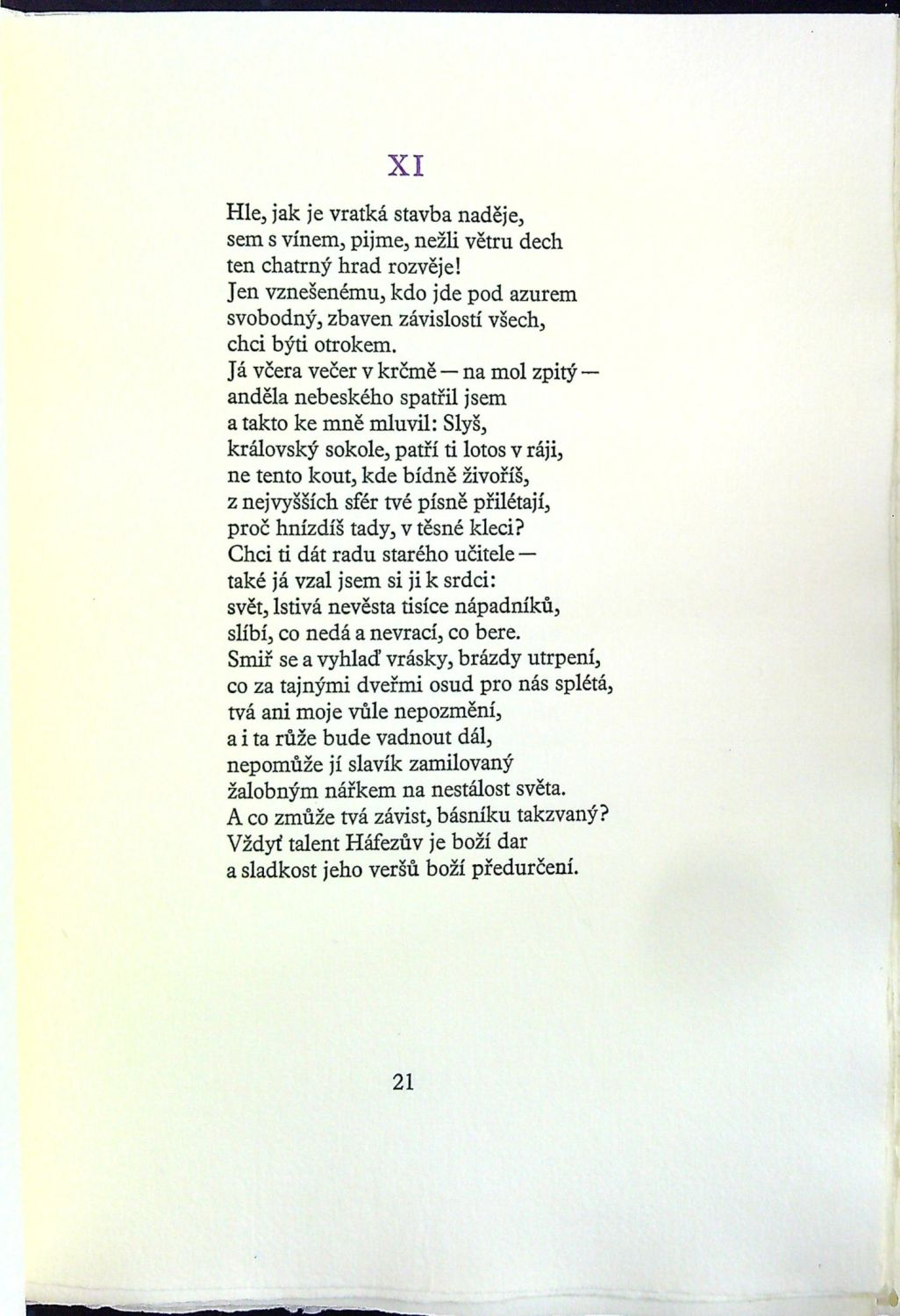 Ex. č. 113 z 200 vydaných, graficky upravil Vladimír Viener, o vydání pečoval Vladimír Beneš, z perštiny přeložila a poznámku napsala Věra Kubíčková. Dvoubarevný tisk, písmem Plantin ručně vysadila Milada Kolafová a vytiskl Ludvík Žižka na ruční papír z Velkých Losin. Kombinované techniky vytiskl Milan Dřímal.