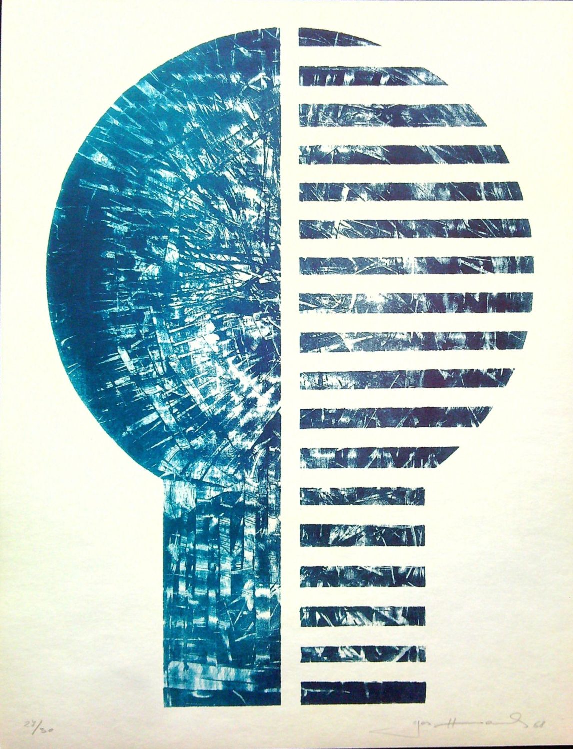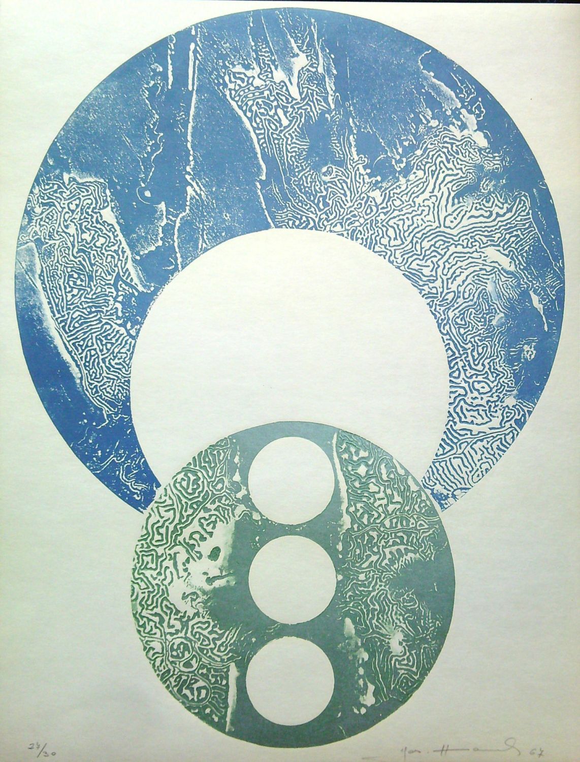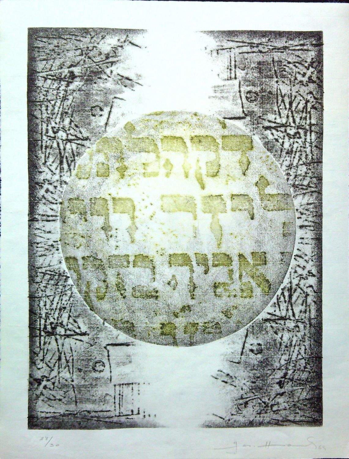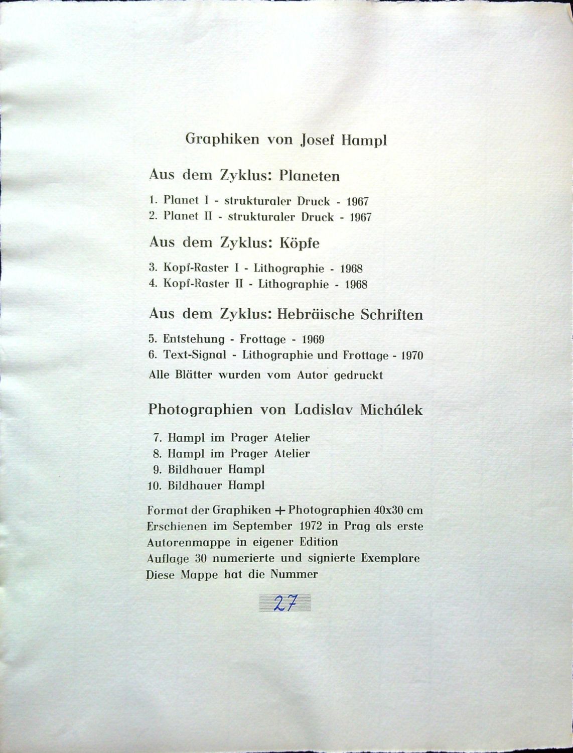 Exemplář číslo 27 ze 30 vydaných v září roku 1972 v Praze. Na prvých dvou listech tištěných na ručním rýhovaném papíře titulní list s tlačeným a zlaceným názvem a tiráž se seznamem prací v cyklu obsažených. Cyklus obsahuje šest původních grafických prací Josefa Hampla. Z cyklu "Planety": 1. Planeta I, strukturální grafika, 1967. 2. Planeta II, strukturální grafika, 1967. Z cyklu "Hlavy": 3. Hlava-mřížka I, litografie, 1967. 4. Hlava-mřížka II, litografie, 1968. Z cyklu "Hebrejské psaní": 5. "Vznik", frotáž, 1969. 6. "Textový signál", litografie s frotáží, 1969. Čtyři původní fotografie Ladislava Michálka: 1. Hampl v pražském atelieru. 2. Hampl v pražském atelieru. 3. Sochař Hampl. 4. Sochař Hampl. Všechny Hamplovy práce jsou autorem vpravo dole tužkou podepsané a datované, vlevo dole číslované. Fotografie Michálkovy jsou autorem tužkou na rubu vpravo dole podepsané a vlevo číslované. Rozměr celého formátu prací je 400 x 300 mm. Všechny své práce si Josef Hampl vytiskl sám. <br>Původní celoplátěná vazba s chlopněmi, které jsou v kruhovém výřezu, který vyplňuje výše zmíněný název. Na přední desce tlačený a zlacený název. Všechny listy jsou volně vložené.