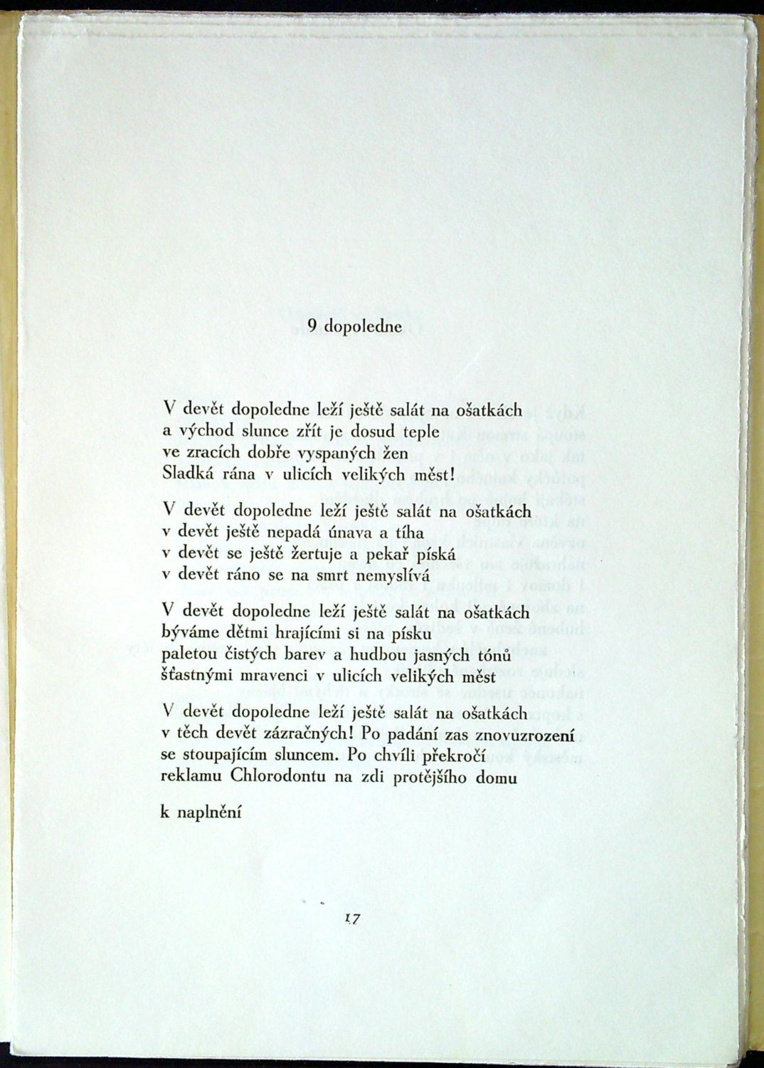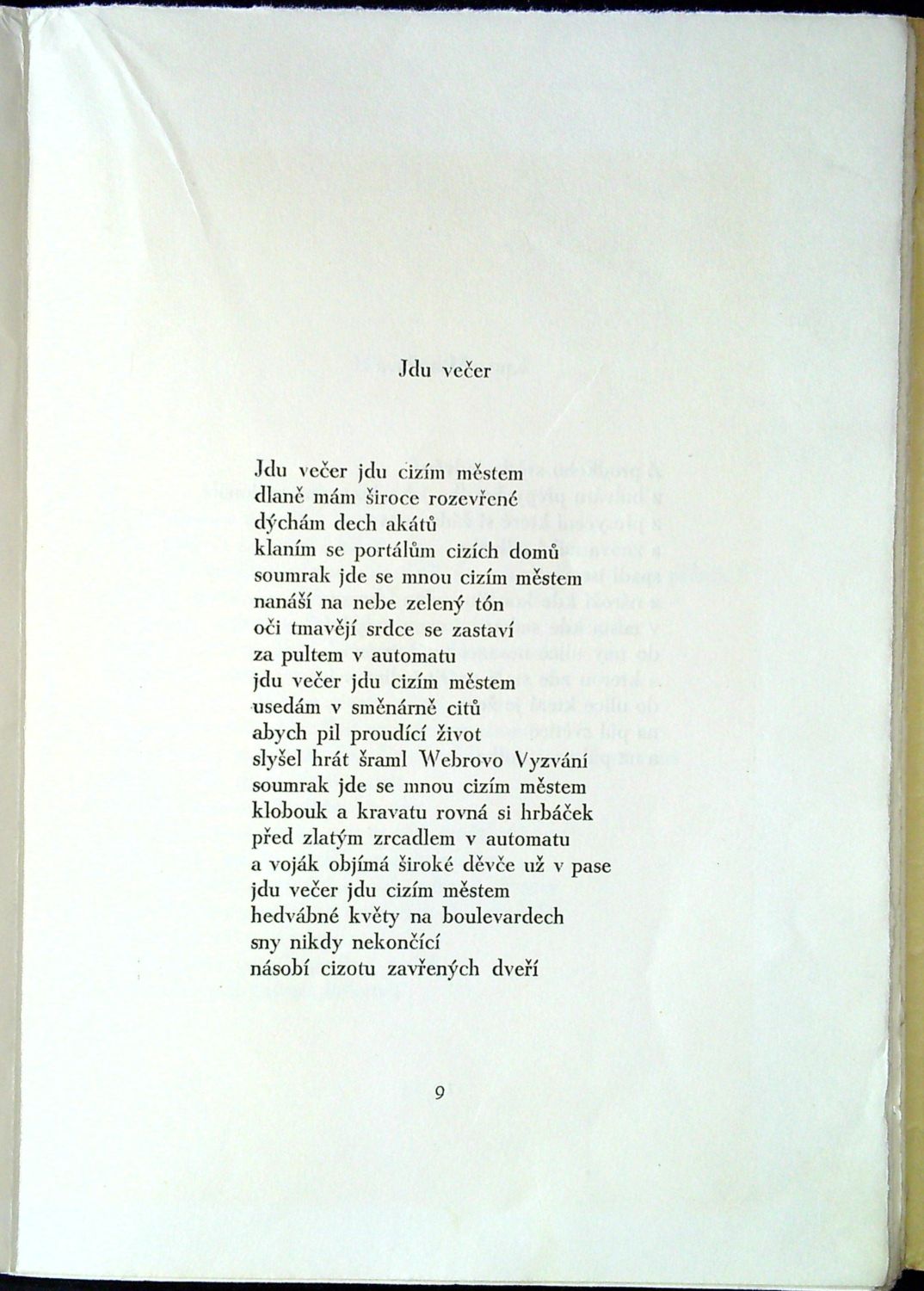 Ex. č. 310 z 500 vydaných, před vlastním textem celostr. reprodukce kresby V. Bartovského, v tiráži podpis básníkův. Původní pap. obálka s chlopní, ve které je volně vložený složený knižní blok. <br>Vzácné vydání jediné Hančovy knihy vyšlé za jeho života. Další knihu pod stejným názvem připravil až z autorovy pozůstalosti Jan Lopatka a vydal Josef Škvorecký v 68 Publ. v Torontu.