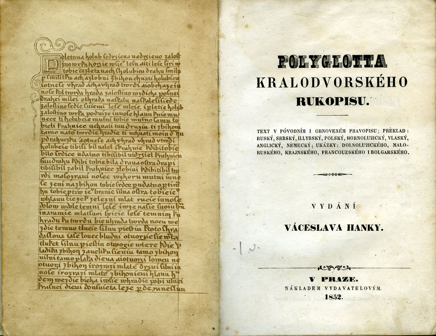 Polyglotta Kralodvorského rukopisu. Text v póvodním i obnoveném pravopisu; překlad: ruský, srbský, illyrský, polský, hornolužický, vlaský, anglický, německý; ukázky: dolnolužického, maloruského, krajinského, francouzského i bolgarského. ...