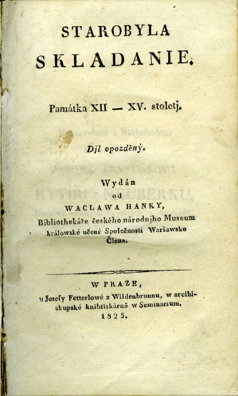 Vazba odřená, jinak velmi dobrý stav. - Václav Hanka, též Váceslav Váceslavič (1791-1861), český spisovatel, jazykovědec a vysokoškolský pedagog. Po vystudování gymnázia v Hradci Králové (1809) odešel studovat theologii do Prahy, v letech 1813-1814 studoval práva ve Vídni. Od roku 1819 působil ve Vlasteneckém muzeu v Praze (dnešní Národní muzeum), od roku 1822 byl jeho bibliotékařem. Nabízená kniha je pátým, dodatkovým svazkem ke čtyřdílnému dílu Skládání starobylá, vydanému v letech 1820-1824 u Bohumila Haase. - Doucha, s. 55.