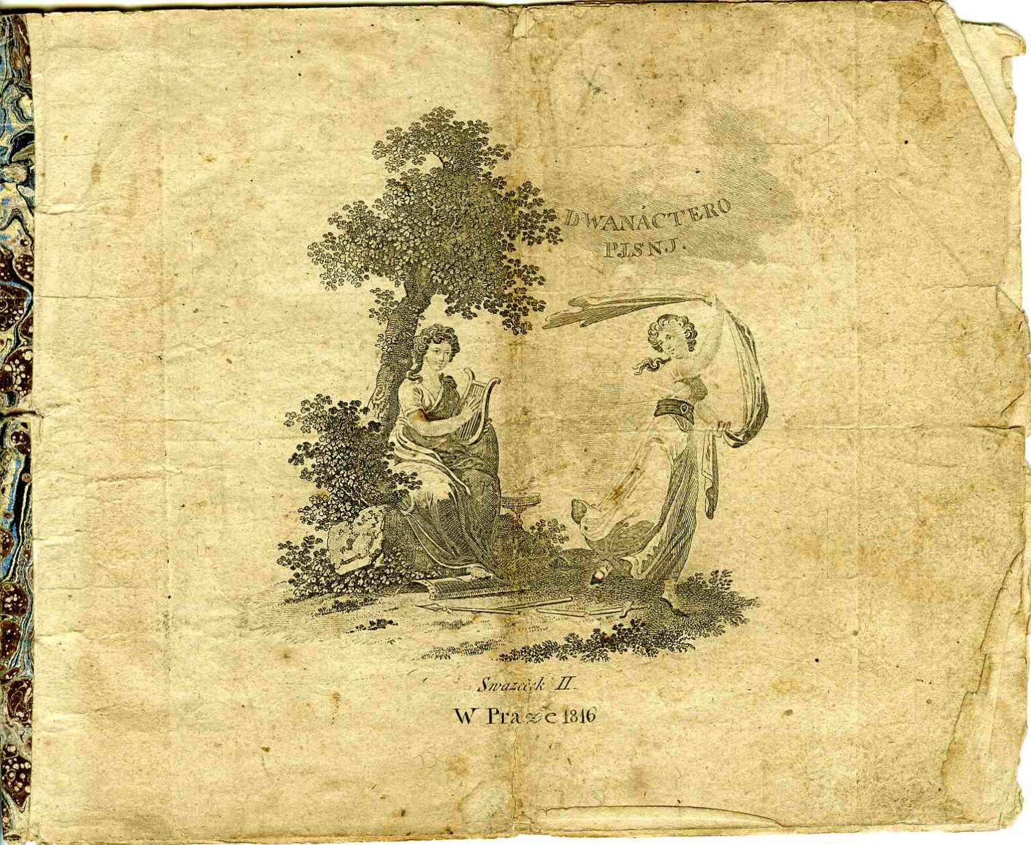 Dvoulisty, slepené původně ve hřbetu proužkem tragantového papíru, rozvolněné, pomačkané, na okrajích roztřepené, vprostřed přeložené, s hnědými skvrnkami, kus spodního okraje posledního listu odtržený bez ztáty textu. - První vydání druhého ze dvou svazků, obsahujícího kromě Hankových básní též po jedné písni od Jana Šafaříka, G. (Augusta Jiřího Pacovského?) Suchánka a Fr. Budislava Veverky. Další vydání tohoto II. sv. následovala v letech 1819, 1831, 1841 a 1851. I. sv. vydaný r. 1815 obsahoval též 12 písní, jednu z nich napsal Michal Silorad Patrčka.<br> Jungmann VI. 287a; Doucha s. 54