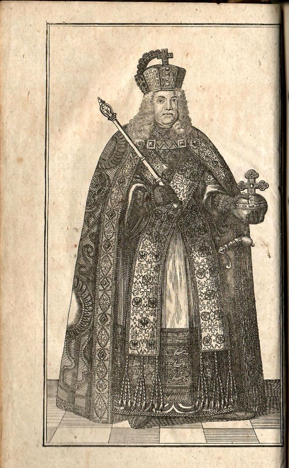 Ve front. mědirytina s vyobrazením římského císaře, mezi str. 54-55 rozkládací mědirytina s vyobrazením korunovace Karla VI. v chrámu sv. Bartoloměje ve Frankfurtu roku 1711, mezi str. 60-61 rozkládací mědirytina s vyobrazením korunovačního banketu, mezi str. 298-299 kolorovaná mědirytina, mapa Rakouské oblasti a přilehlých krajů, mezi str. 472-473 rozkládací genealogická tabule rakouských panovníků, v textu 3 přílohy (jedna dřevořezová, dvě mědirytinové) s vyobrazením královských insignií a medailí s portréty panovníků. Dřevořezové viněty, vlysy. <br>Dobová vazba z tmavé hověziny, ve hřbetu 4 vazy, ve druhém poli tlačený a zlacený název, ve třetím poli vyznačení dílu. Na předsádkách dobový tragantový papír. Vazba ohmataná, při spodním i horním okraji hřbetu mírně natržená. <br>Pouze II. díl ze XVI vydaných.