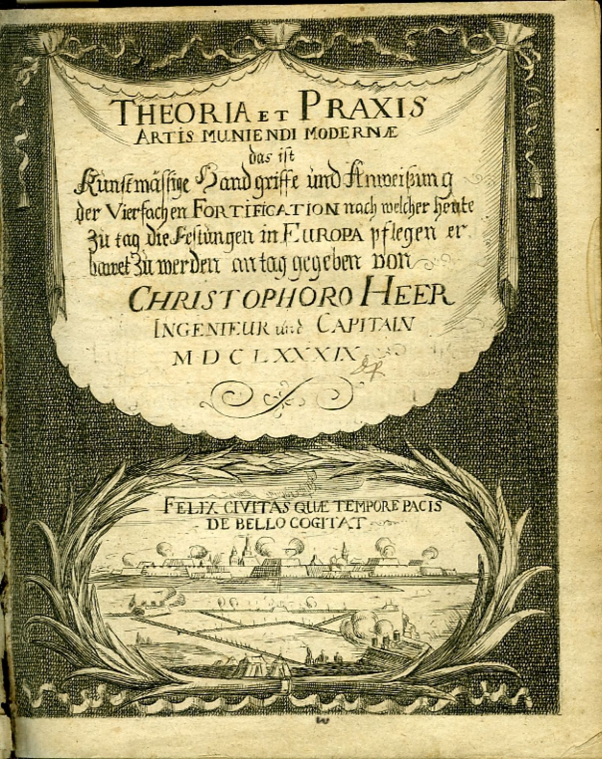 1) Heer, Christoph: SPECULUM ARTIS MUNIENDI LUCIDISSIMUM, Das ist: Hell=Leüchtender FORTIFICATIONS-Spiegel, In welchem der eigentliche Ursprung des Festungs=Baues, und Desselben rechtmäßige Defension, so auff der Cortinen, und Fauffebray bestehet, klärlich zu sehen, und noch mehr durch unterschiedliche Festungs=Abrisse bekräfftiget wird: Itzo aus den Mathematischen Fundamenten ausgearbeitet, und an Tag gegeben von ..., Leipzig, Friedrich Lanckischens Erben, 1694, [XII]-162 str. + 2 listy + 31 mědiryt. příloh, dřevořezové vlysy, iniciály propletené úponky zalomené do výše 2-5 řádků, tučně tištěné versálky, viněty, nadpisy kapitol tištěné kursivou. Na konci seznam příloh s vyobr. různých typů fortifikací, jejich umístění v krajině, nástroje, nářadí a pomůcek používané při stavbě, geometrické náčrty.<br>Obě díla jsou kompletní. Christoph Heer (1637-1701), německý inženýr a teoretik fortifikačních staveb, působil jako hlavní inženýr u saského dvora a podílel se na stavbě opevnění Mannheimu.<br>