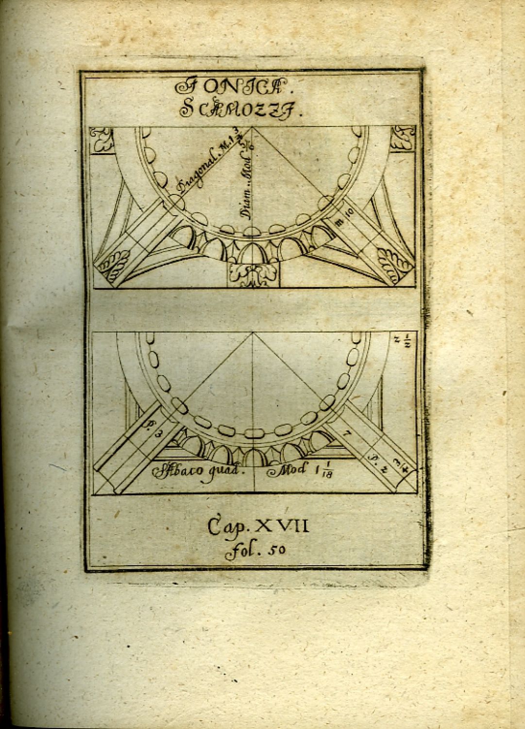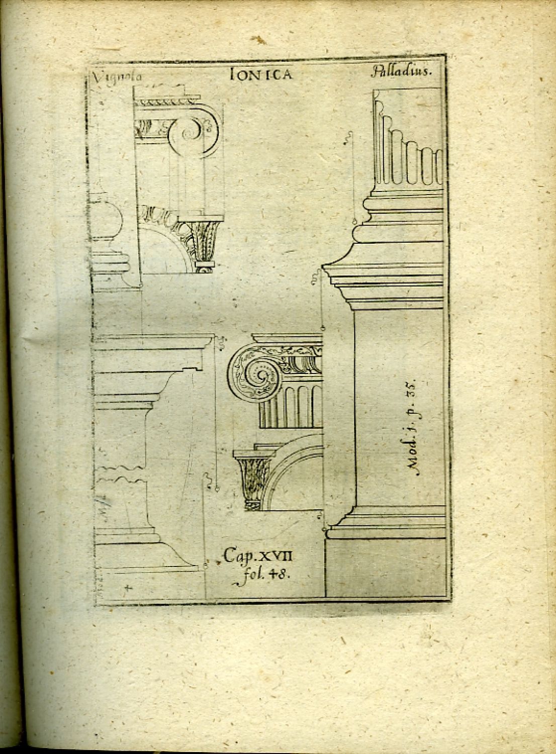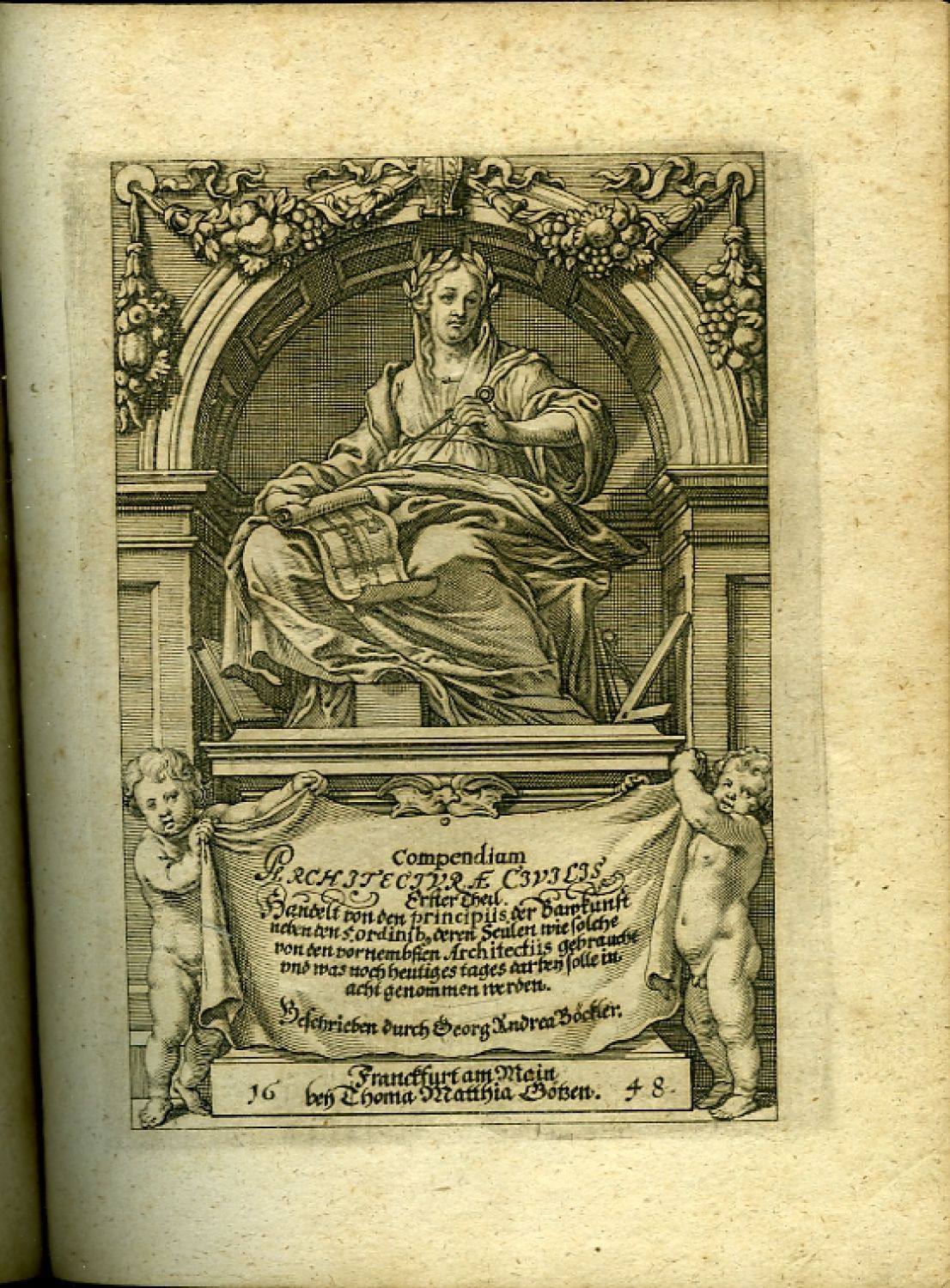 2) Böckler, Georg Andreas: COMPENDIUM ARCHITECTURAE CIVILIS. Erster Theyl. Das ist Kurtze unnd gründliche Verfassung oder Bericht von der Bawkunst, darinnen nicht allein die nothwendigste Observationes eines Bawplatzes, sondern auch die Steine, Sand, Kalck, Mawren, Fundamenta und Holzwerck betreffend, neben den Fünff Ordinibus deren Säulen, in solcher Maaß und Proportion, wie dieselbige von Vitruvio, Iac. Baroz. von Vignola, Palladio, Seb. Serlio, und Vinc. Scamozzi, invertirt und gebraucht worden, auch was noch heutiges Tages ferner dabey solle in Acht genommen werden, alles getrewlichste beschrieben und gewiesen wird. Francfurt am Main, Thomas Matthias Götzen, 1648, [X]-66-[VI] str. Do mědi rytý předtitul, 40 leptaných tabulí s ukázkami detailů dórských, ionských, korintských a toskánských sloupů a jejich hlavic v podání Palladia, Scamoziho a Vignoli; vstupní pásový vlys a ozdobné tyče z ornamentů, iniciály propletené úponky zalomené do výše 3-4 řádků, živá záhlaví, tištěné poznámky po stranách. Komplet, vyšel pouze první díl.<br>Johann Andreas Böckler (cca 1617 Cronheim - 21.2.1687 Ansbach), německý architekt, inženýr a teoretik, autor několika odborných knih. Jako architekt působil v Norimberku, jeho specializací byla hydraulická architektura, o které napsal několik knih. Nejznámější a nejdůležitější je jeho práce "Architectura curiosa nova". Poslední prací je komentované vydání prvních dvou knih Palladiových v německém jazyce, které však vyšlo až 11 let po jeho smrti. Z jeho architektonických realizací se nic nedochovalo.<br>