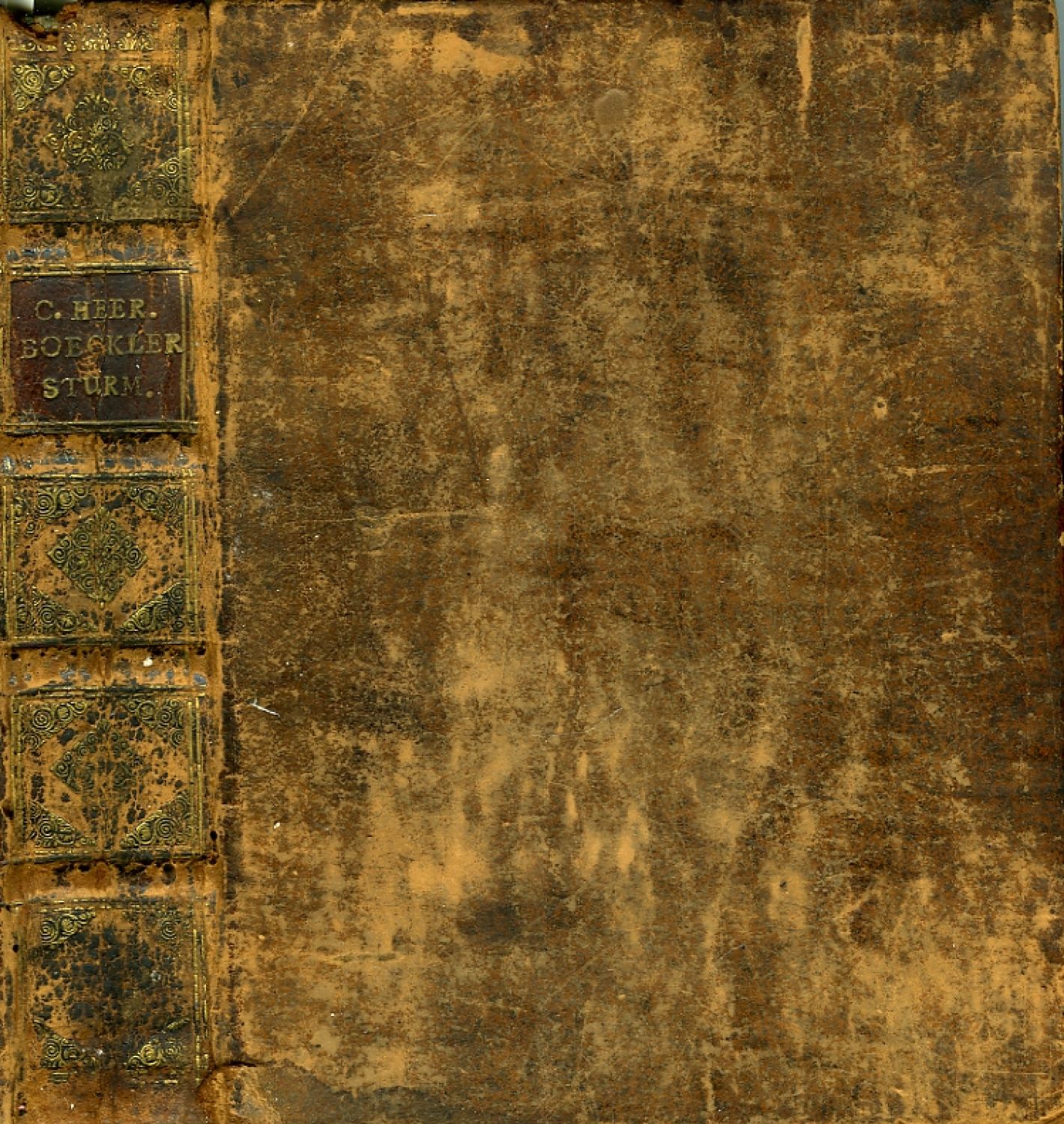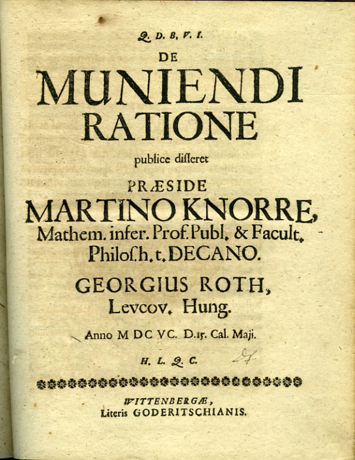 4) Roth, Georgius: DE MUNIENDI RATIONE publice difleret PRAESIDE MARTINO KNORRE, .... Wittenberg, Literis Goderitschianis, 1695, (8) listů + 1 rozkl. příloha s rytým výpočtem. Vstupní vlys z rostlinných ornamentů, úvodní konturová iniciála na rostlinném pozadí ve výši 5 řádků. Chybí konec, pravděpodobně 4 listy.<br>Vazba z hnědé hověziny z konce 18. století, ve hřbetu 4 vazy, ve druhém poli dobový kožený štítek s tlačeným a zlaceným názvem prvé knihy, v ostatních polích tlačené a zlacené ozdůbky rostlinného charakteru, barvené ořízky. Vazba ohmataná a místy odřená, při horním i spodním okraji hřbetu natržená, zlacení ve hřbetu vybledlé a odřené. Na předním přídeští rkp. vlastnické záznamy z roku 1700 a 1707.
