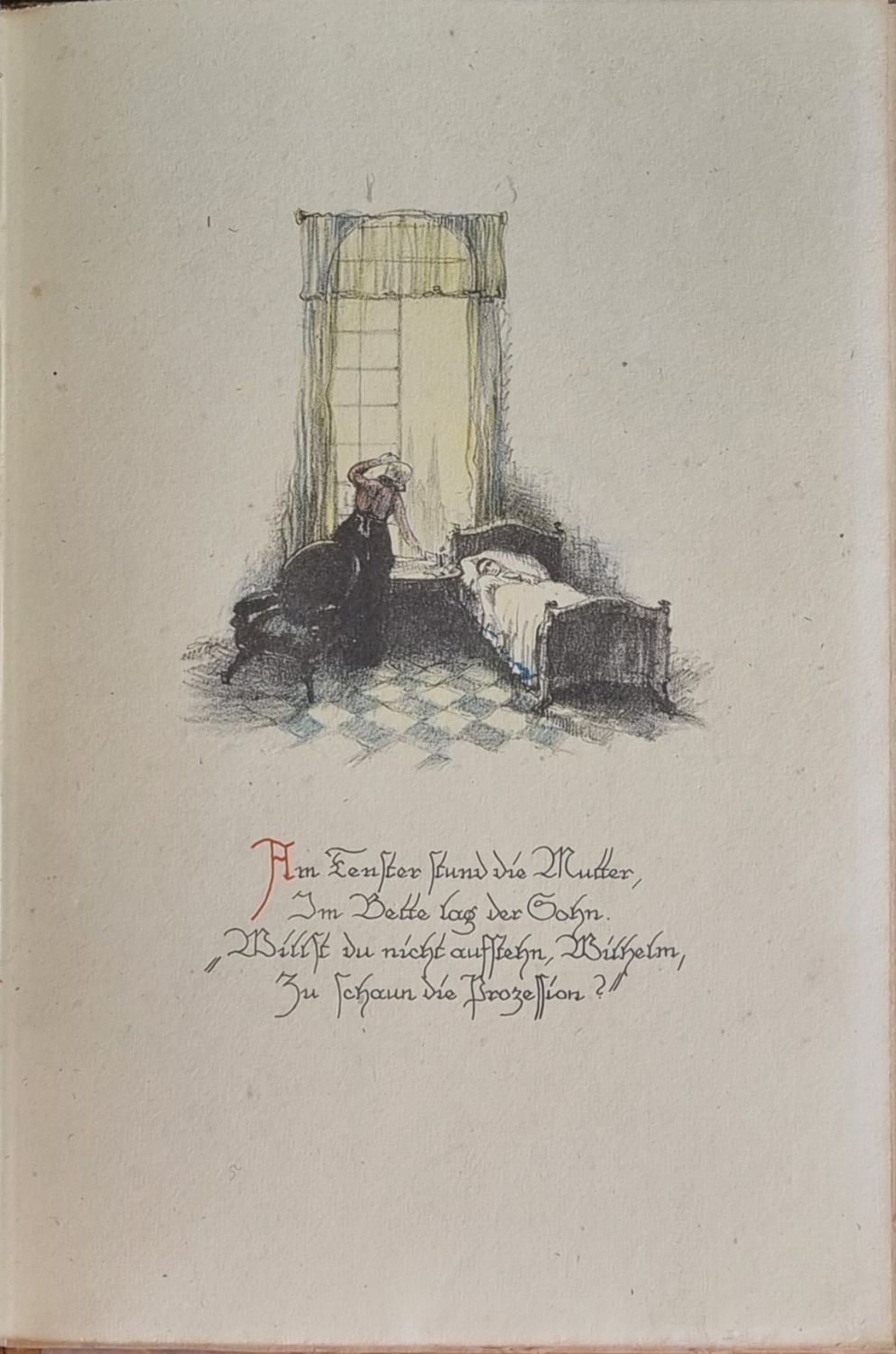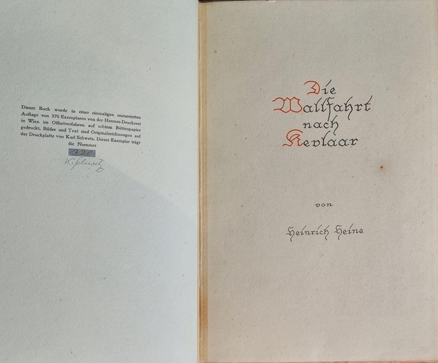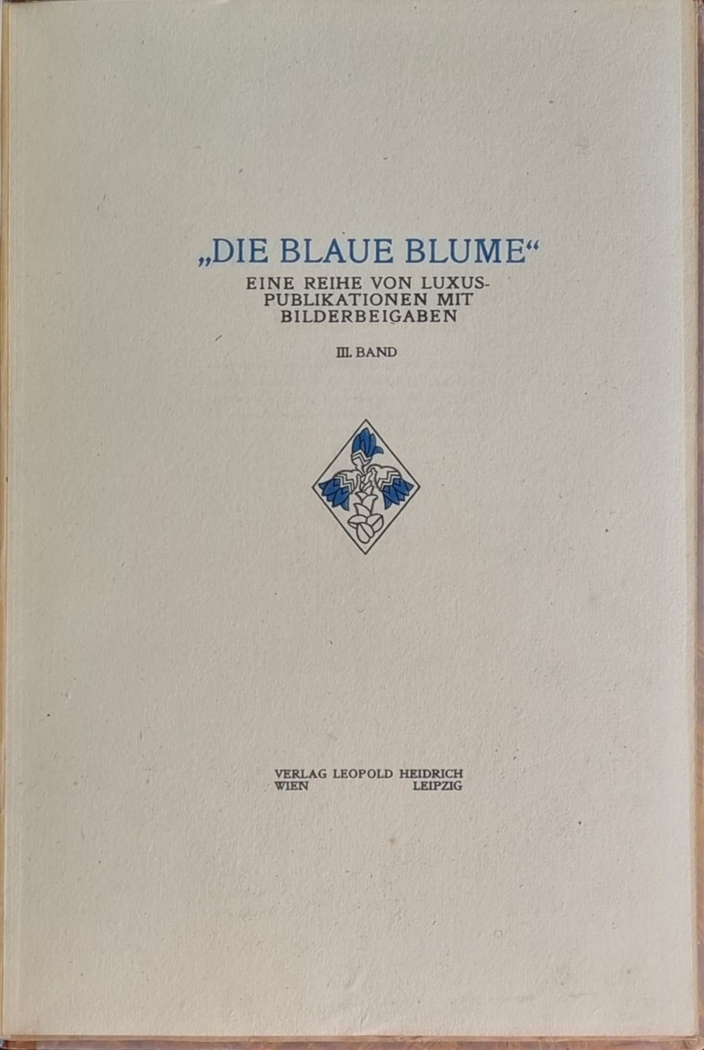 Exemplář číslo 320 z 370 vydaných a tištěných tiskárnou Hermes-Druckerei na ruční papír, dvoubarevný tisk. V textu 14 barevných litografií Karl Schwetze a značka na stránce s názvem edice. V tiráži podpis K. Schwetze tužkou. Kniha vyšla jako III. svazek luxusní edice "Die Blaue Blume". <br>Původní kartonová vazba potažená olejovým papírem, na přední straně vazby název a drobná Schwetzova ilustrace, kožený hřbet. <br>Karl Schwetz (4.7. 1888 Kanitz, Morava - 21.3. 1965 Vídeň), rakouský malíř a grafik. V letech 1912 až 1923 pracoval pro Wiener Werkstätte, navrhl a vytvořil řadu pohlednic. Ve dvacátých letech spolupracoval též s Josefem Florianem pro jehož nakladatelství vytvořil několik ilustrací a původních grafických listů.
