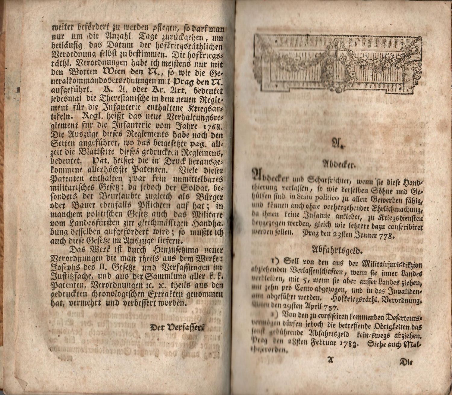 BCBT 10428<br>Německý text švabachem latinská slova antikvou, živá záhlaví mezi jednoduchými linkami, na tit. listu mědiryt s vyobrazením dvouhlavého orla s válečnými emblémy sign. J. Berka, v záhlaví listu A1a dřevoryt. vlys (římsa s girlandou), tučně tištěné plné iniciály.<br>Dobová vazba s kartonovými deskami potaženými mramorovaným papírem, kožený hřbet a nárožnice, ve hřbetu 4 vazy, jednotlivá pole olemovaná dvojitou zlacenou linkou, ve druhém poli světle hnědý dobový kožený štítek s tlačeným a zlaceným názvem, v ostatních polích tlačený a zlacený rostlinný ornament, při spodním okraji hřbetu tlačené a zlacené iniciály prvního vlastníka knihy a objednatele vazby "W.Z.D.T." (Wencel Zischka de Trotznov), stříkané ořízky. Vazba ohmataná, místy odřená, na přední desce v koženém pokryvu u hřbetu proděravělá, při horním i spodním okraji hřbetu drobné dírky od červotoče, naražené rohy. Na předním přídeští zbytky červené pečetě a při spodním okraji perem vlastnický přípis "Wencel Zischka de Trotz.", na tit. listu stará začerněná razítka, která jsou též na straně poslední, na straně 36 nezačerněné razítko "I. Infant. Regiment Bibliothek ?". Papír místy zahnědlý.