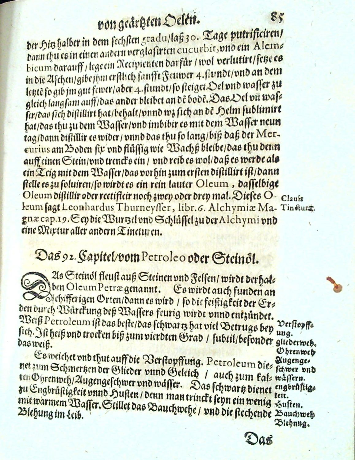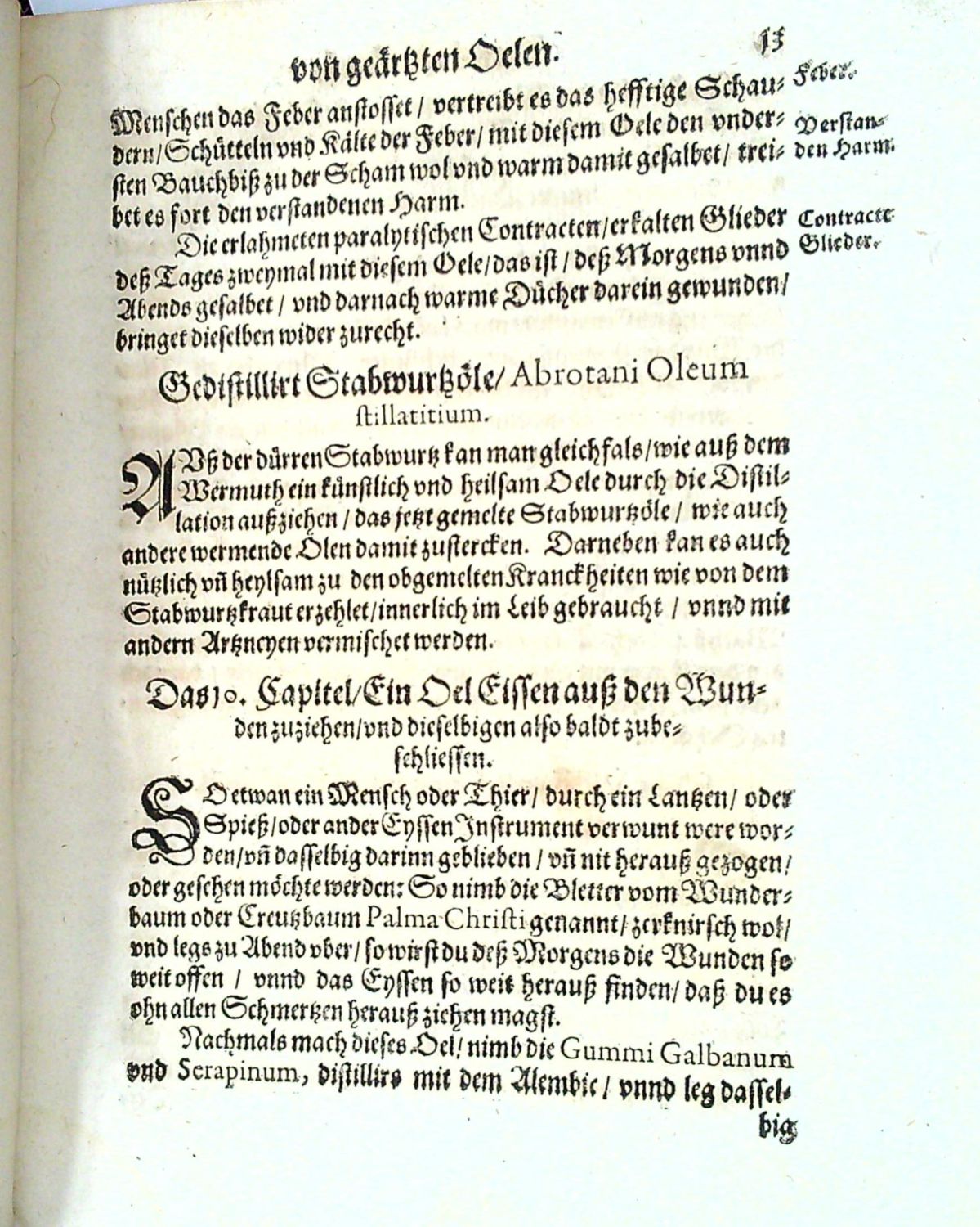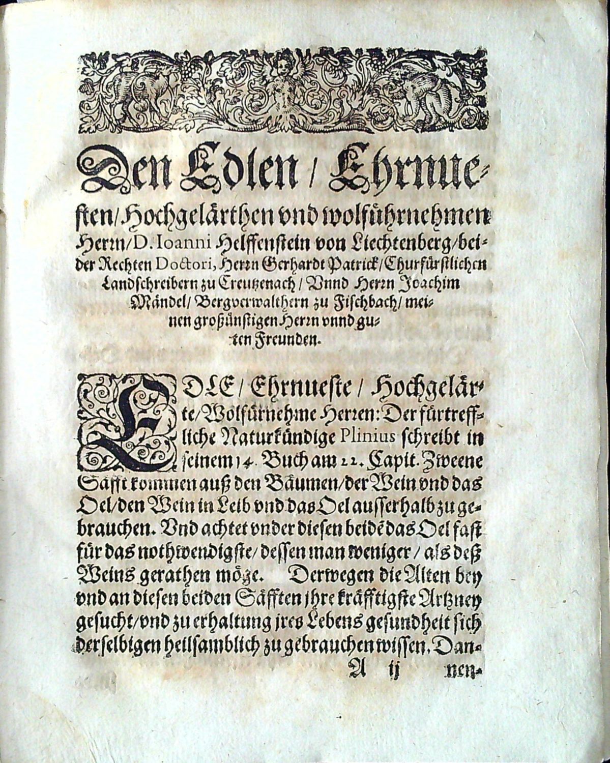 Kartonová vazba potažená mramorovaným papírem z konce 18. století, zašpiněná a ohmataná, v dolní části hřbetu chybí papír (cca 3 cm), v horní části též (cca 0.5 cm), naražené rohy. Titulní list tištěn dvoubarevně, v jeho spodní části dřevořezová viněta, tit. list na několika místech proděravělý, chybí část slova "Darinnen", vzniklý otvor je z rubu podlepen papírem, vstupní a závěrečná dřevořezová viněta, dvě ozdobné iniciály rostlinného dekoru ve výši pěti řádek, jinak plné iniciály ve výši řádek tří. Na první straně v textu dřevořez "stromu života". Papír místy zahnědlý, na dvou místech v textu oválné otvory po chybějícím papíru (cca o průměru 1 cm). Na předním přídeští rkp. poznámky v latinském jazyce z 18. století, na straně 157-158 při okraji papír podlepen.<br>Friedrich Helbach (1568 - 1638) kněz ve Wickenrodtu, alchymista, autor několika spisů o přípravě olejů a různých elixírů.<br>9 Bl., 165-11 S. Mit Holzschnitt-Vignete auf dem Titel, Kopf - und Schlussvignette und 1 Abb. im Text. Späterer marmorierter Pappband (berieben, Ecken bestossen, Rücken mit Bezugsfehlstellen). 3 Löcher auf dem rot/schwarz gedruckten Titel, 1 auf dem fünften nn. Bl. und 1 auf d. S. 157/8, alle mit etwas Buchstabenverlust. Die grössten 2 Löcher in etwa Grösse 2 x 2 cm auf dem Titel und auf d. S. 157/8 hinterlegt. Einige Bl. stark gebräunt. Als vorderer Vorsatz wurde lateinische Handschrift auf Papier verwendet.<br>Friedrich Helbach (1568-1638), Pfarrer in Wickenrodt, beschriebt in der vorliegenden Schrift verschiedene Zubereitungsweisen zur Öl- und Salzherstellung, die zu Beginn des 17. Jahrhunderts tradiert waren. Dabei steht die Bereitung wirkmächtiger Medikamente gleichberechtigt neben den rein alchemistischen Aufbereitungen. Beschrieben wurde neben Herstellung und Verwendung von Arzneimitteln aus Fetten und etherischen Ölen auch z. B. die technische Herstellung des Vitriolöls (rauchende Schwefelsäure) durch Glühen von Eisenvitriol. Die Kunst, alle Dinge in der Natur, insbesondere aber die Metalle, in Öl und Salz zu verkehren, ist eines der grossen und zentralen Mysterien der Alchemie.<br>Fergusson I, 373.
