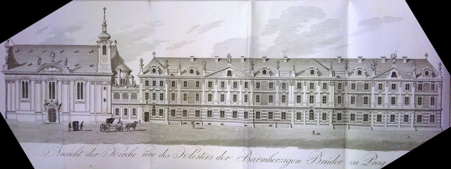 | Ilustrace: | Ve front. rozkl. mědiryt od G. Döblera podle C. Haase s pohledem na kostel a klášter Milosrdných bratří v Praze, za s. 96 rozkl. mědiryt s půdorysným plánem kláštera a zahrady, za s. 107 rozkl. akvatinta - vyobr. největšího sálu tohoto nemocničního zařízení. |