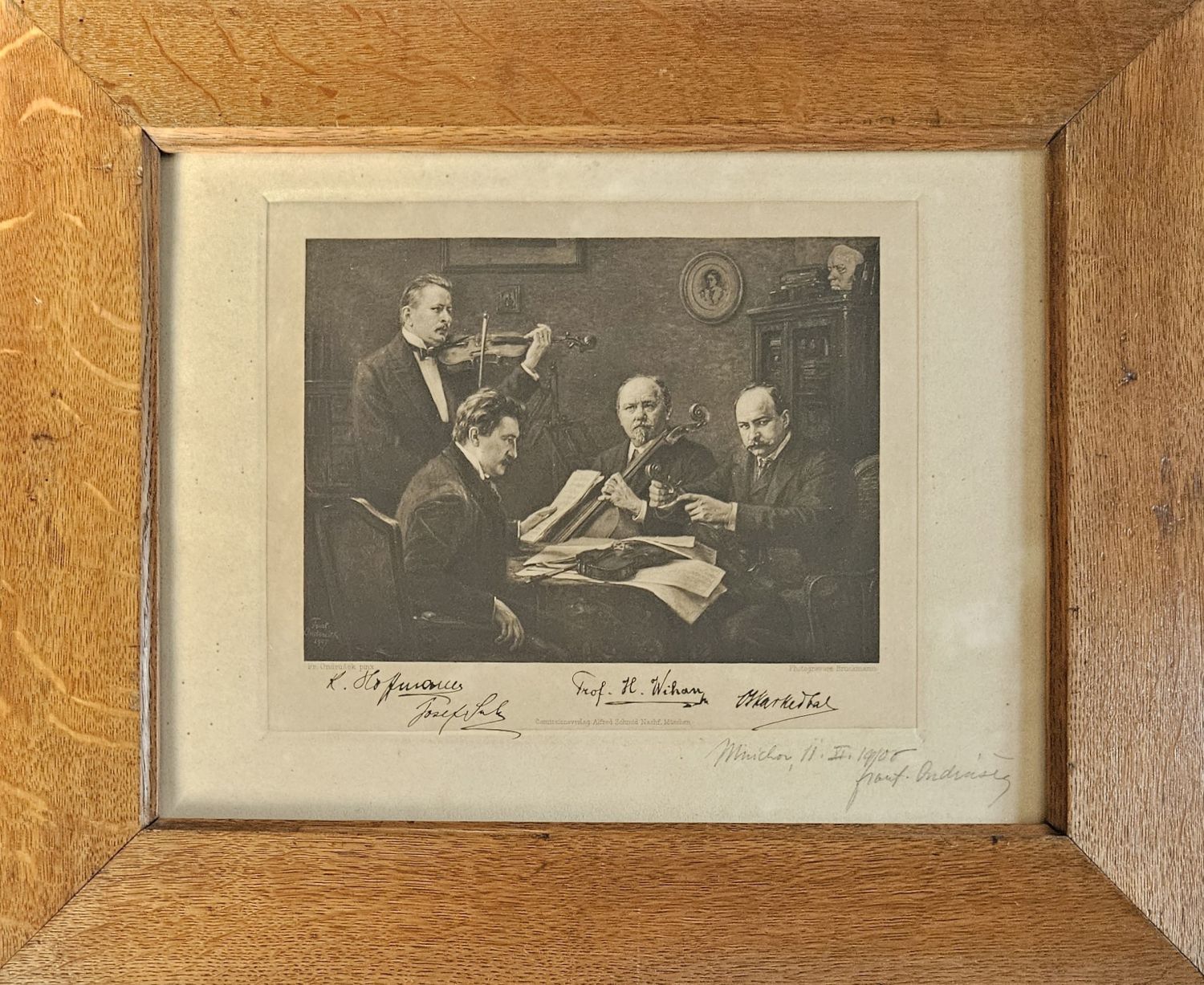 Heliogravura reprodukující malbu Františka Ondrůška s vyobrazením Českého kvarteta. V desce heliogravury podpisy černým perem všech členů kvarteta, Karla Hofmana, Josefa Suka, Hanuše Wihana a Oskara Nedbala, pod deskou podpis tužkou Františka Ondrůška s datací, Mnichov, 11.XI. 1905 (6 ?). - Práce je opatřena hnědým dobovým rámem o rozměru 343 x 410 mm (rozměr heliogravury 180 x 220 mm).