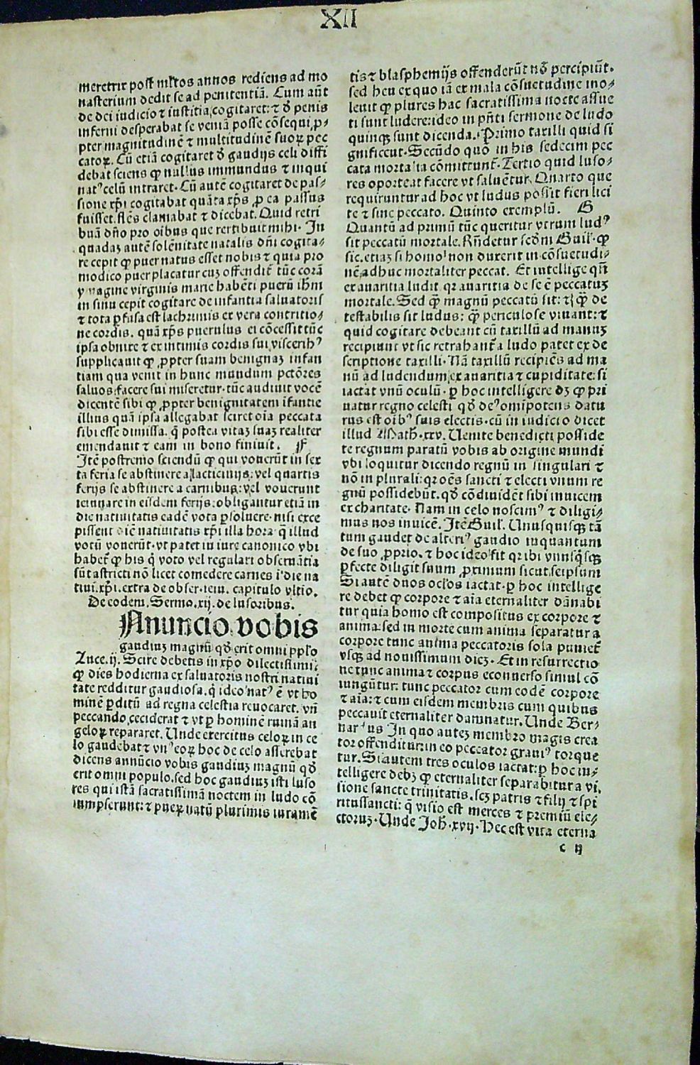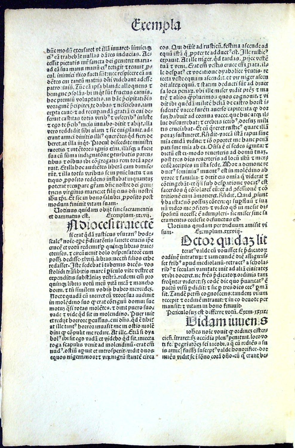 ISTC ih00113800 - eviduje 14 ex., z toho 6 nekompletních; GW 12358<br>Tištěno rotundou ve dvou sloupcích, 51 řádků, živá záhlaví, v kolofonu červeně tištěný signet tiskařův. Čtyři části - první s názvem "Sermones de tempore", druhá "Sermones de sanctis" s římsky číslovanými listy I-XLVIII + 3 nečísl. listy rejstříku, třetí část s názvem "Promptuarium exemplorum", čtvrtá "Promptuarium de miraculis" (3. a 4. nepaginovaná). <br>Pergamenová převazba (238 x 154 mm) z druhé poloviny 16. století, na obou deskách zbytky vázacích tkanic, vazba ohmataná a zašpiněná, při okrajích mírně potrhaná, na přední desce dvě drobné stopy od červotoče. Papír místy lehce zahnědlý, folio a2 přes celou šíři šikmo natržené a viditelně slepené, posledních 9 listů včetně kolofonu restaurovaných - při vnitřním horním okraji utržený papír odborně dolitý (na šesti listech ztráta mírně zasahuje do textu), knižní blok při horním okraji zčásti oříznutý po živá záhlaví. V textu řada rukopisných dobových marginálií černým perem. Na předním přídeští nalepeno vlastnické ex libris "Patrick Le Lay", na titulním listu staré razítko knihovny "Ecole Saint-Elme Arcachon".<br>Johann Herolt (cca 1390 - srpen 1468 Řezno) byl německý dominikánský kazatel známý též pod jménem Discipulus, byl jedním z hlavních představitelů nové spirituality v Německu, která kladla důraz na praktické pastorační práce. V letech 1437 až 1443 byl převorem dominikánského kláštera v Norimberku. Jeho "Sermones Discipuli" byly jednou z nejvydávanějších knih kázání v 15. století.<br> Kompletní vydání vzácného lyonského vydání, které vytiskli původem němečtí tiskaři působící v Lyonu - Nicolaus Philippi (v letech 1477-1488) a Marcus Reinhart (v letech 1477-1482).