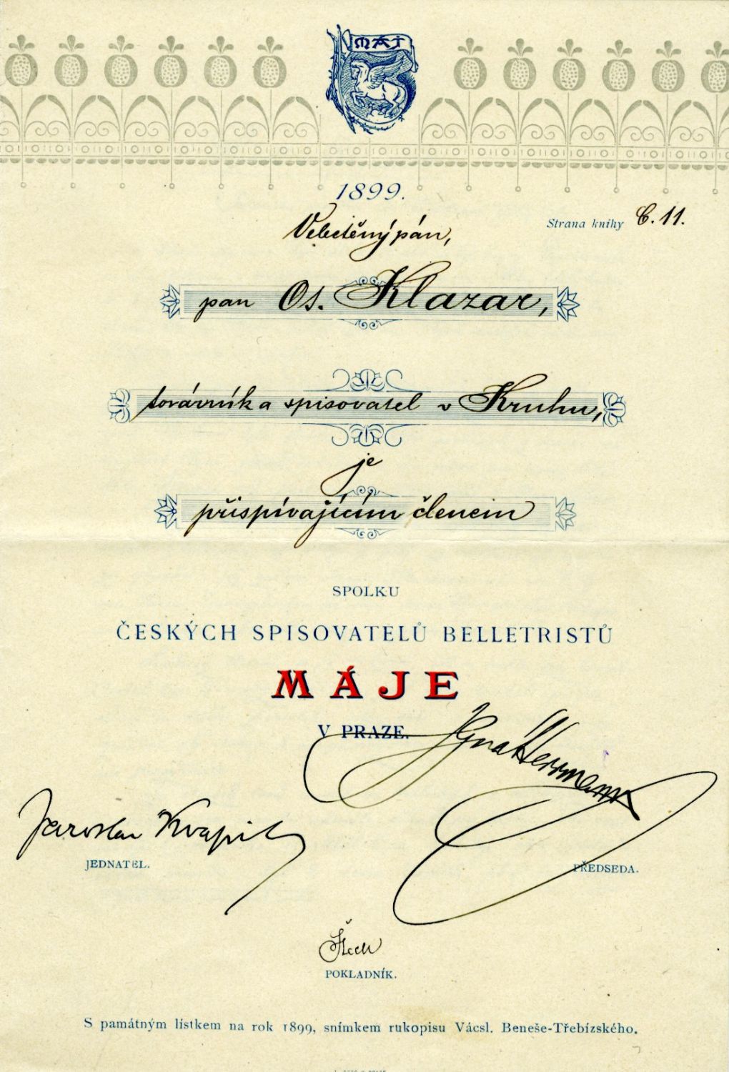 Památný list na rok 1899 spolku českých spisovatelů beletristů Máje v Praze pro pana Ot. Klazara, továrníka a spisovatele v Kruhu s podpisy předsedy Ignáta Herrmanna, jednatele Jaroslava Kvapila a pokladníka Štecha, na druhém listu faksimile rkp. Václav Beneše Třebízského.