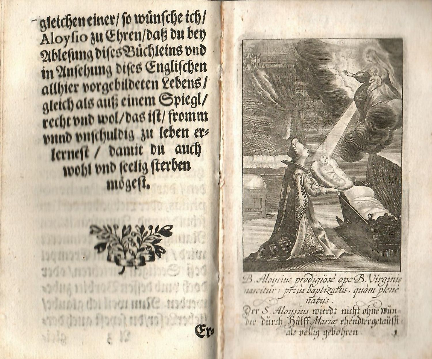 | Ilustrace: | Ve front. mědiryt. portrét sv. Aloise Gonzagy, v textu 46 celostr. mědiryt. příloh s rytým doprovodným textem. Rytiny zhotovil J. U. Kraus dle předlohy G. P. Puechera (rytina ve front. signovaná). |
