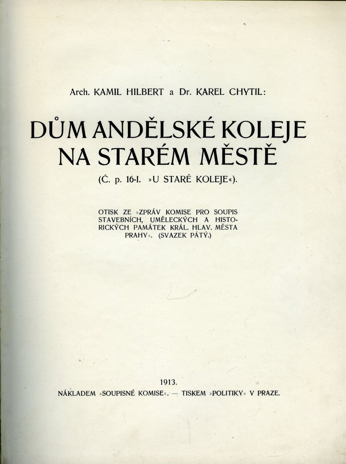 Dům Andělské koleje na Starém Městě (Č. p. 16-I. "U Staré koleje"). Otisk ze "Zpráv komise pro soupis stavebních, uměleckých a historických památek král. hlav. města Prahy". (Svazek pátý.)