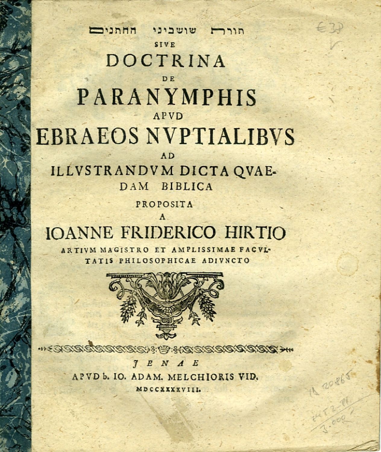 Tora šuševine ha-hatunnim [přepis z hebrejštiny] SIVE DOCTRINA PARABYMPHIS APVD EBRAEOS NVPTIALIBVS AD ILLVSTRANDVM DICTA QVAEDAM BIBLICA PROPOSITA A ......
