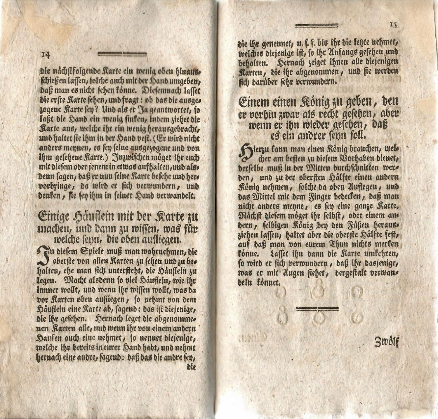 Tištěno švabachem, tučně tištěné iniciály ve výši 2-3 řádků, uprostřed horního okraje stran dvojitá mizící linka, na tit. listu viněta, vstupní vlys ve dvojitém rámečku, koncová viněta. - Knížka obsahuje popis celkem 149 karetních a kouzelnických triků.<br>Nová černě zbarvená kožená vazba se třemi vazy ve hřbetu. Knižní blok odborně restaurovaný, při okrajích místy chybící papír dolitý, poslední dvě původně roztrhané strany dolité. Pouze 2. díl ze dvou vydaných.<br>Kniha vyšla poprvé v anglickém jazyce roku 1634. Do němčiny ji přeložil roku 1667 Elias Piluland a jedná se o jednu z nejstarších publikovaných knih zabývajících se karetními a kouzelnickými triky. Do dnešního dne se nepodařilo zjistit jméno anglického autora (někteří badatelé se domnívají, že autorem byl známý anglický kouzelník a bavič William Vincent, který občas při svých produkcích vystupoval pod jménem "Hocus Pocus"). Elias Piluland je zmíněný jako překladatel v doslovu prvního německého vydání z roku 1667, dále vyšla roku 1674 pod jeho jménem knížka o počítání mincí a roku 1679 je uveden jako editor latinského vydání Ciceronových a Erasmových dopisů. Jinak o jeho osobě není známo nic. (Možná je jméno slovní hříčkou z latiny "Alias Pilula", různé i chytré kuličky jsou v díle zmíněny jako součást různých triků). - Byť nekompletní, ale velmi vzácné a kuriosní dílko.