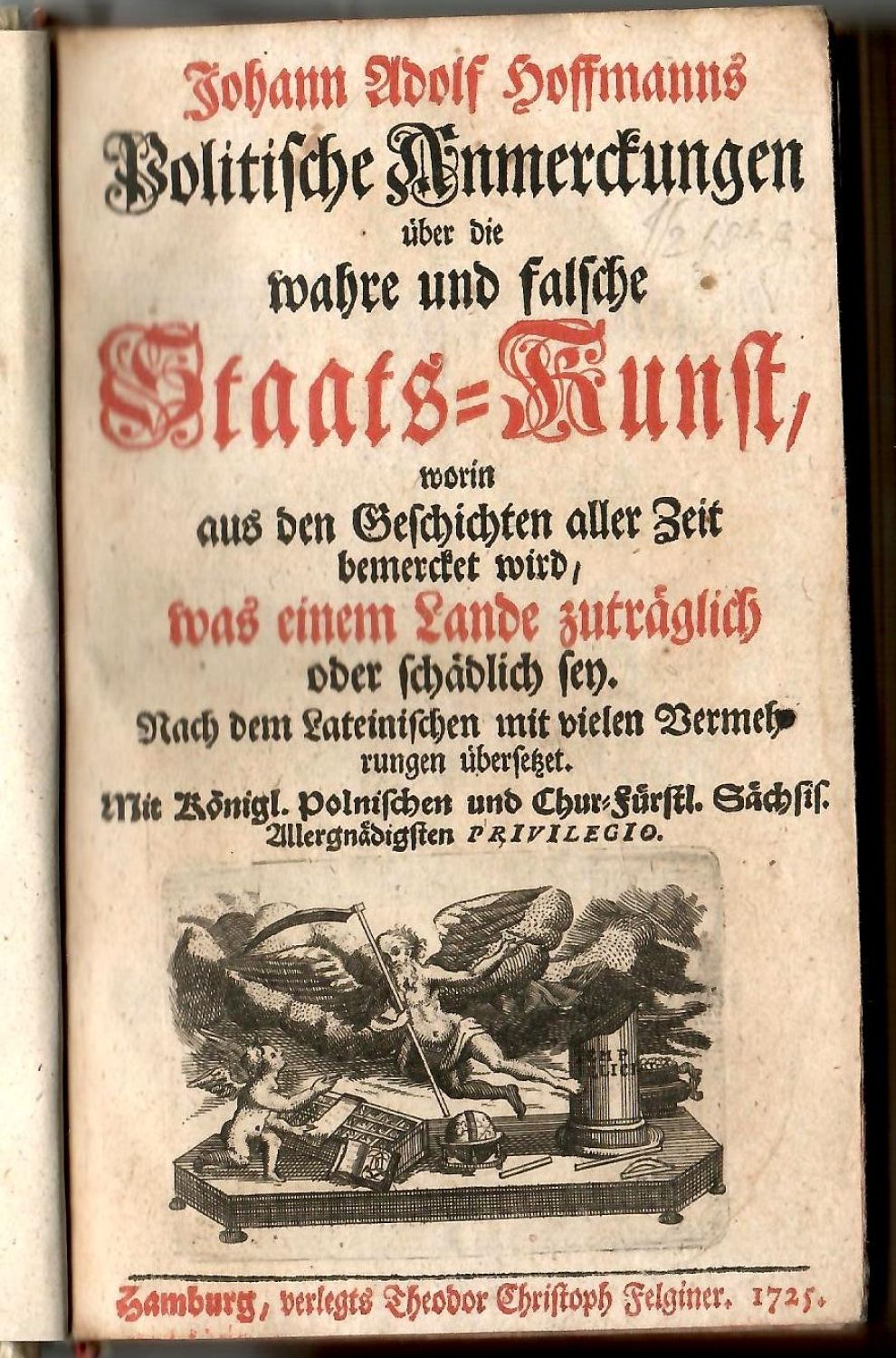 Politische Anmerckungen über die wahre und falsche Staats=Kunst, worin aus den Geschichten aller Zeit bemercket wird, was einem Lande zuträglich oder schädlich sey. Nach dem Lateinischen mit vielen Vermehrungen übersetzet. Mit Königl. Polnischen und Chur=Fürstl. Sächsis. Allergnädigsten PRIVILEGIO.
