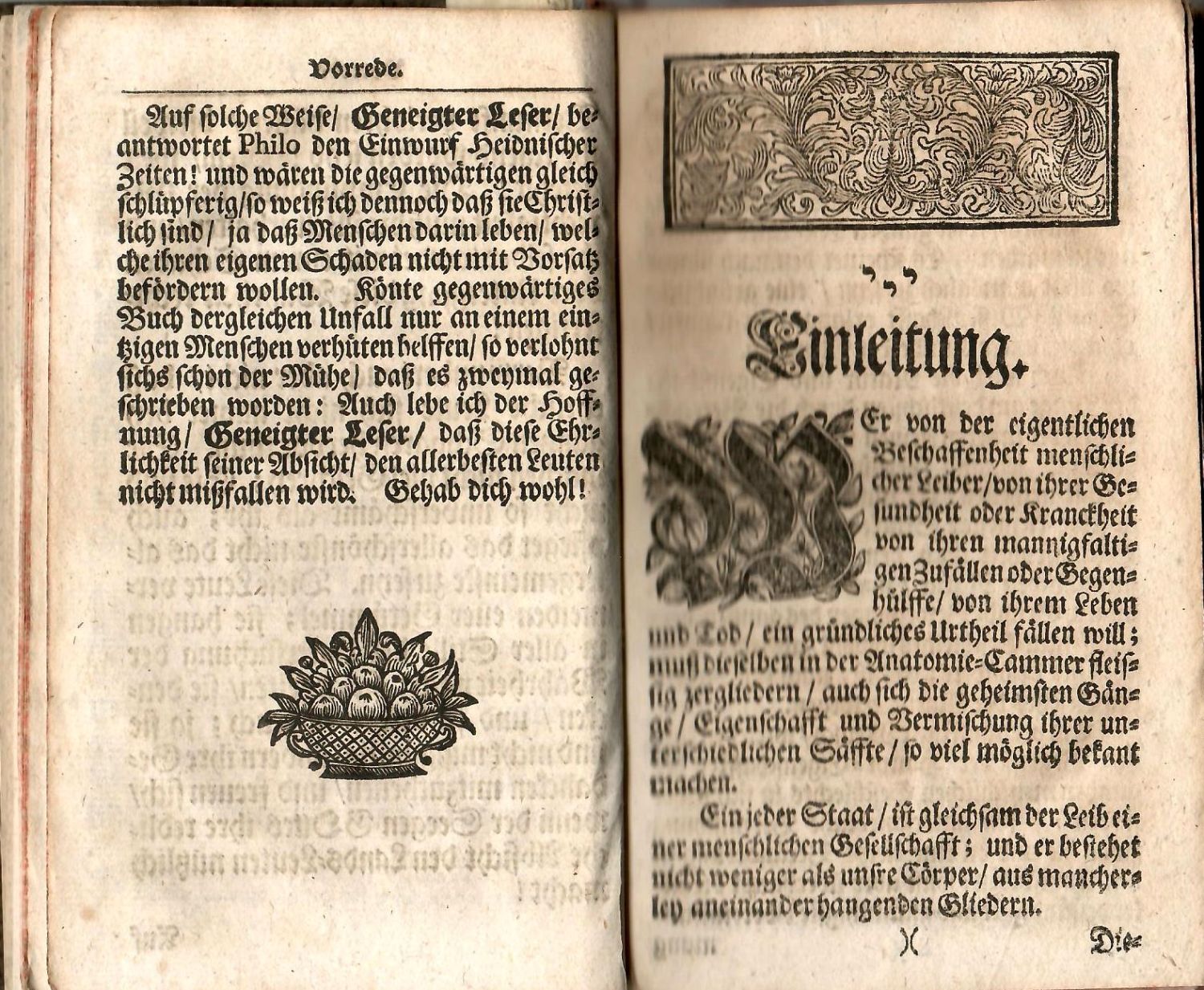 Dvoubarevně tištěný titulní list s mědirytinovou vinětou, na rubu folia 2 mědirytina s vyobrazením Augusta Wilhelma vévody z Braunschweigu a Lüneburgu, kterému je kniha dedikována. Vlysy v jednoduchých rámcích, viněty, konturové iniciály propletené úponky zalomené do výše 3-7 řádků, živá záhlaví od sazby oddělená jednoduchou linkou, tištěné poznámky v latině pod čarou. Místy chybná paginace stran.<br>Nová vazba s kartonovými deskami potaženými škrobovým papírem a pergamenovým hřbetem, červeně barvené ořízky. Ochranné kartonové pouzdro. Vazba je dílem ateliéru Krupka z Úval u Prahy. Nový předsádkový papír.<br>Johann Adolf Hoffmann (26.8. 1676 Zarpen - 17.11. 1736 Hamburg), byl německý filosofický autor a překladatel. Patřil k raným osvícencům v Německu, ve svých dílech se snažil propojit své pojetí etiky s ekonomickými myšlenkami a zvláštní pozornost věnoval úvahám o pravém a falešném státnictví. Do německého jazyka přeložil úvahy Marka Aurelia a také Cicerona.