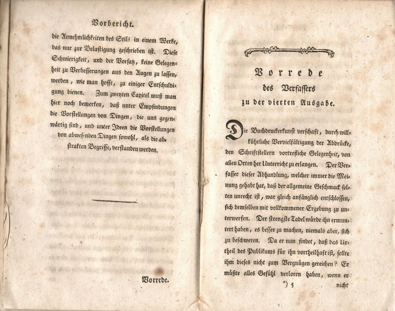 Tištěno švabachem, živá záhlaví, tištěné poznámky pod čarou.<br>Dobová kartonová vazba potažená světle modrým papírem, barvené ořízky. Vazba zašpiněná, pap. pokryv místy potrhaný, u prvního svazku ve hřbetu z větší části chybí. Papír místy zahnědlý, tu a tam drobné hnědé skvrny, tit. list 2. svazku uvolněný z knižního bloku. - Z anglického 4. vydání do němčiny přeložil Johann Nikolas Meinhard.<br>Henry Home (1696 Berwickshire - 27.12. 1782 Edinburgh) skotský spisovatel, filosof a soudce, ústřední postava skotského osvícenství, zakládající člen Filosofické společnosti v Edinburghu.