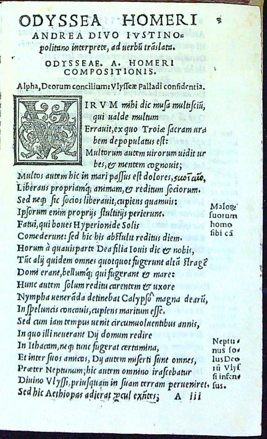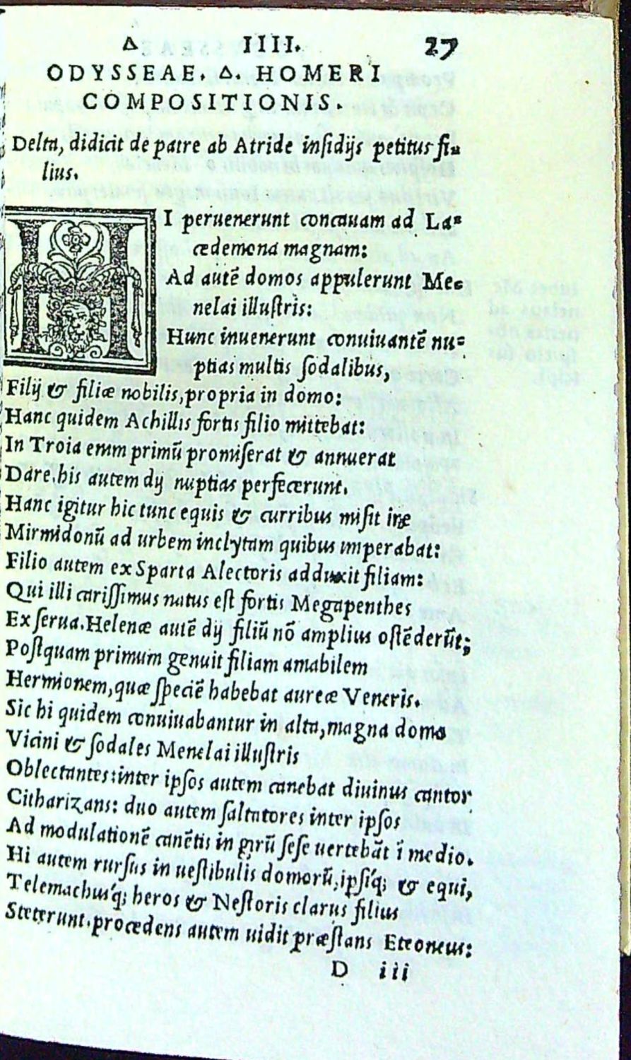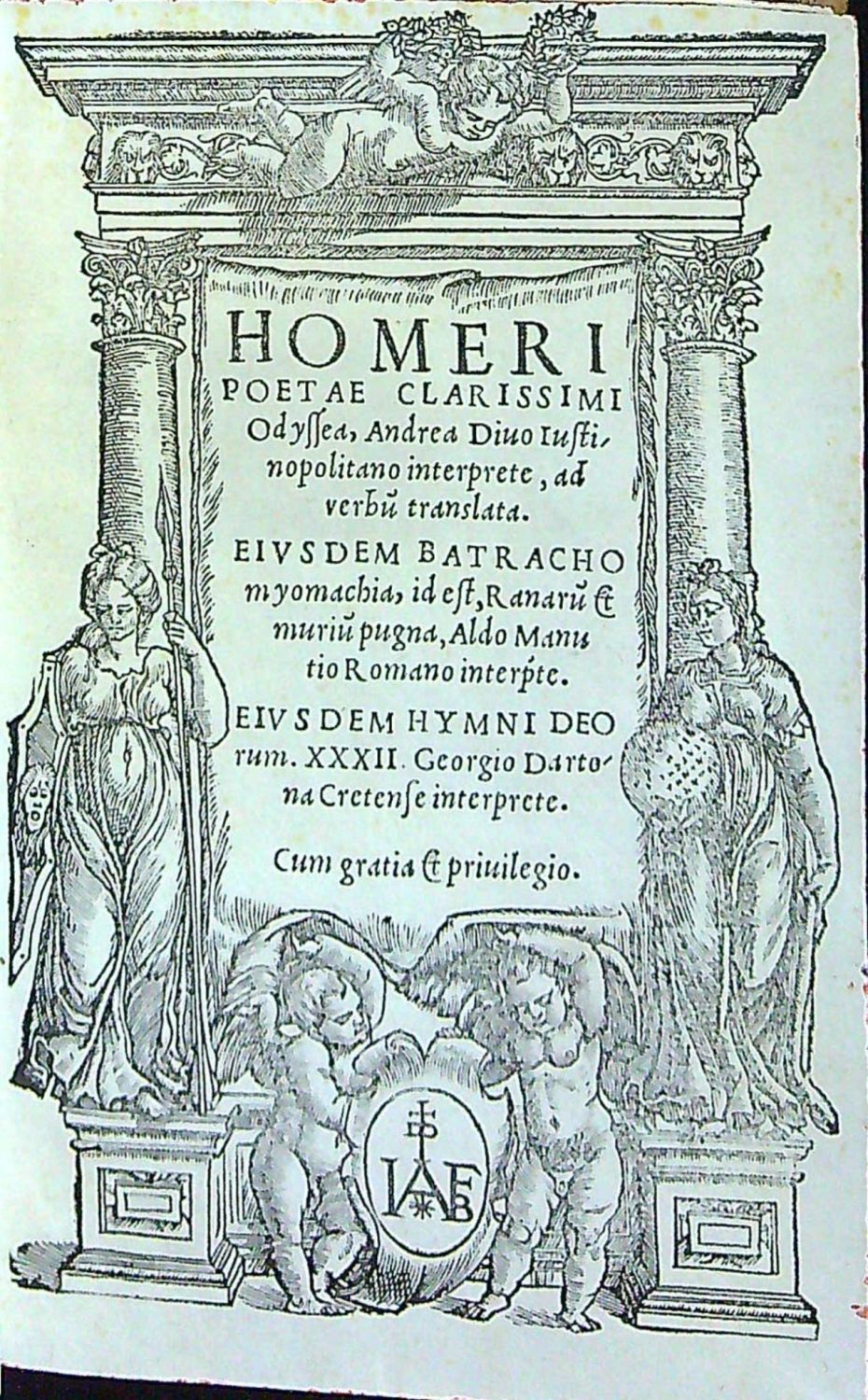 Adams H,770 (Ilias)<br>Titulní list 1. svazku "HOMERI POETAE CLARISSIMI Odyssea, Andrea Diuo Iustinopolitano interprete, ad verbu[m] translata. EIUSDEM BATRACHOmyomachia, id est, Ranaru[m] et muriu[m] pugna, Aldo Manutio interp[re]te. EIVS DEM HYMNI DEO rum. XXXII. Georgio Dartona Cretense interprete". Titulní list 2. sv. "HOMERI POETARVM OMNIVM Principis ILLIAS, Andrea Diuo Iustinopola[n]o intereprete, ad verbu[m] translata. HERODOTI HALICAR nassei libellus, Homeri vita fidelissime continens, Conrado Heresbachio interprete. Cum Indice copiosissimo". Titulní listy zakomponované v renesanční borduře, v textu řada konturových a plných iniciál zasazených v jednoduchém dvojitém rámečku na ilustrativním, či florálním pozadí, zalomených do výše 4-6 řádků, v obou svazcích signety I. A. Burgofrancha. Živá záhlaví, tištěné poznámky po stranách, v Odyssee od folia 214 interpretace Homéra od Alda Manutia. Do latiny přeložil Andrea Diuo. <br>Pergamenové vazby z 18. století, ve hřbetu 3 vazy, v prvním poli černým perem napsaný název, stříkané ořízky.<br>Andreas Divus (italsky Andrea Divo Giustinopolitano či do Capodistria) renesanční učenec 16. století, latinská podoba jeho příjmení Justinopolitano naznačuje jeho původ v Kopru (Justinopolis), dnes na území Slovinska, jinak se o jeho životě ví velmi málo. Jeho překlady Homéra do latiny jsou takřka doslovné a jedná se o první tištěné latinské překlady.