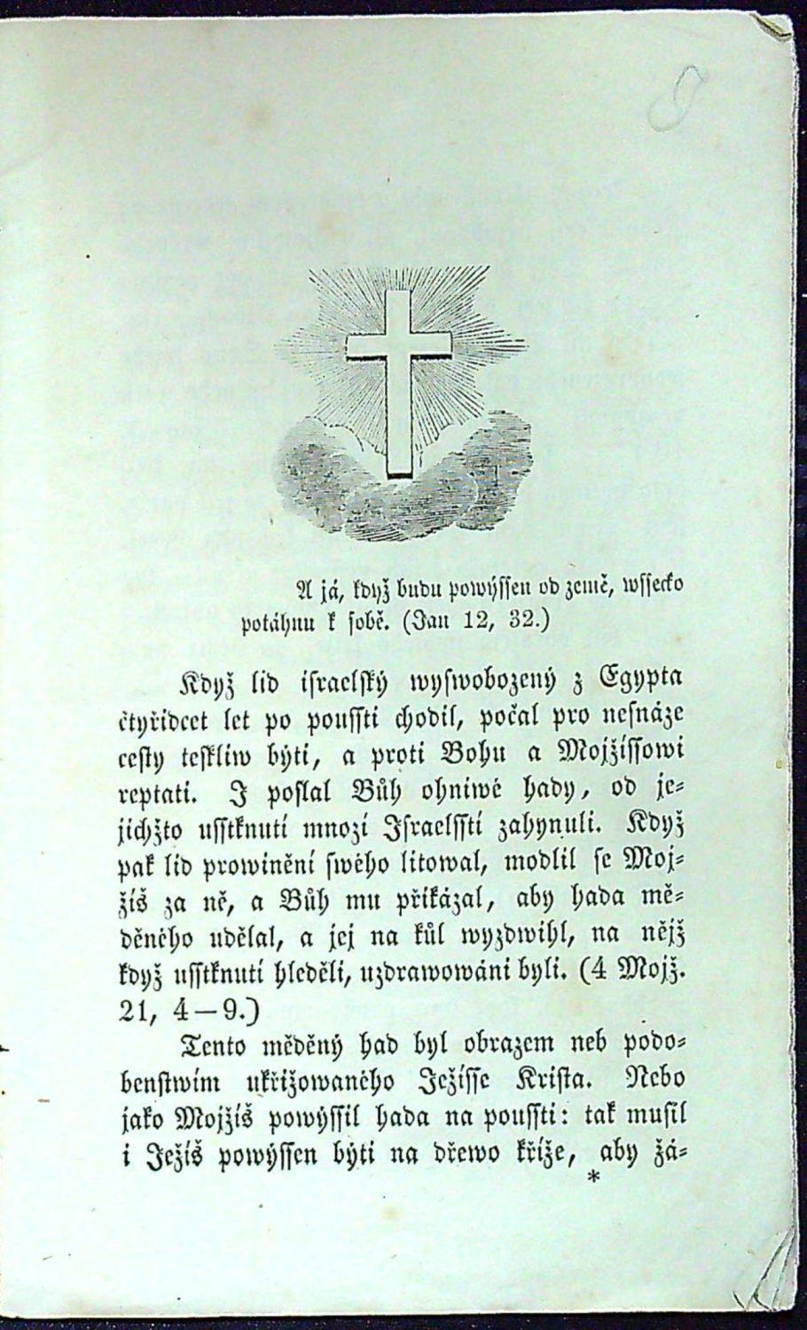 Tištěno švabachem, v záhlaví prvé strany textu xylografie s vyobrazením kříže nad oblaky, koncová viněta. - Původní brožurka přes hřbet přelepená dobovou pap. zelenou páskou. Oslí uši, tit. list lehce zašpiněný s drobnými hnědými skvrnkami.